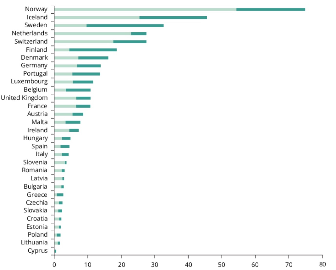 За відсотком електричних та гібридних автівок серед загальної кількості нових реєстрацій машин Франція значно поступається країнам північної Європи.