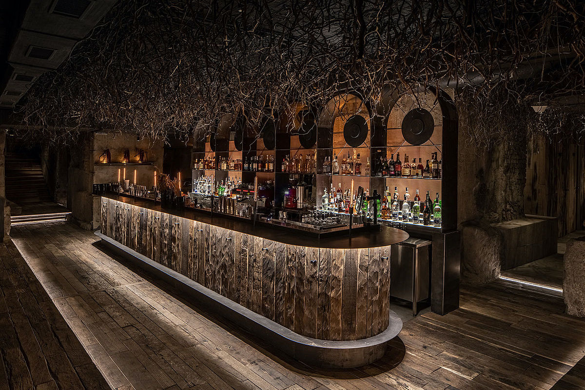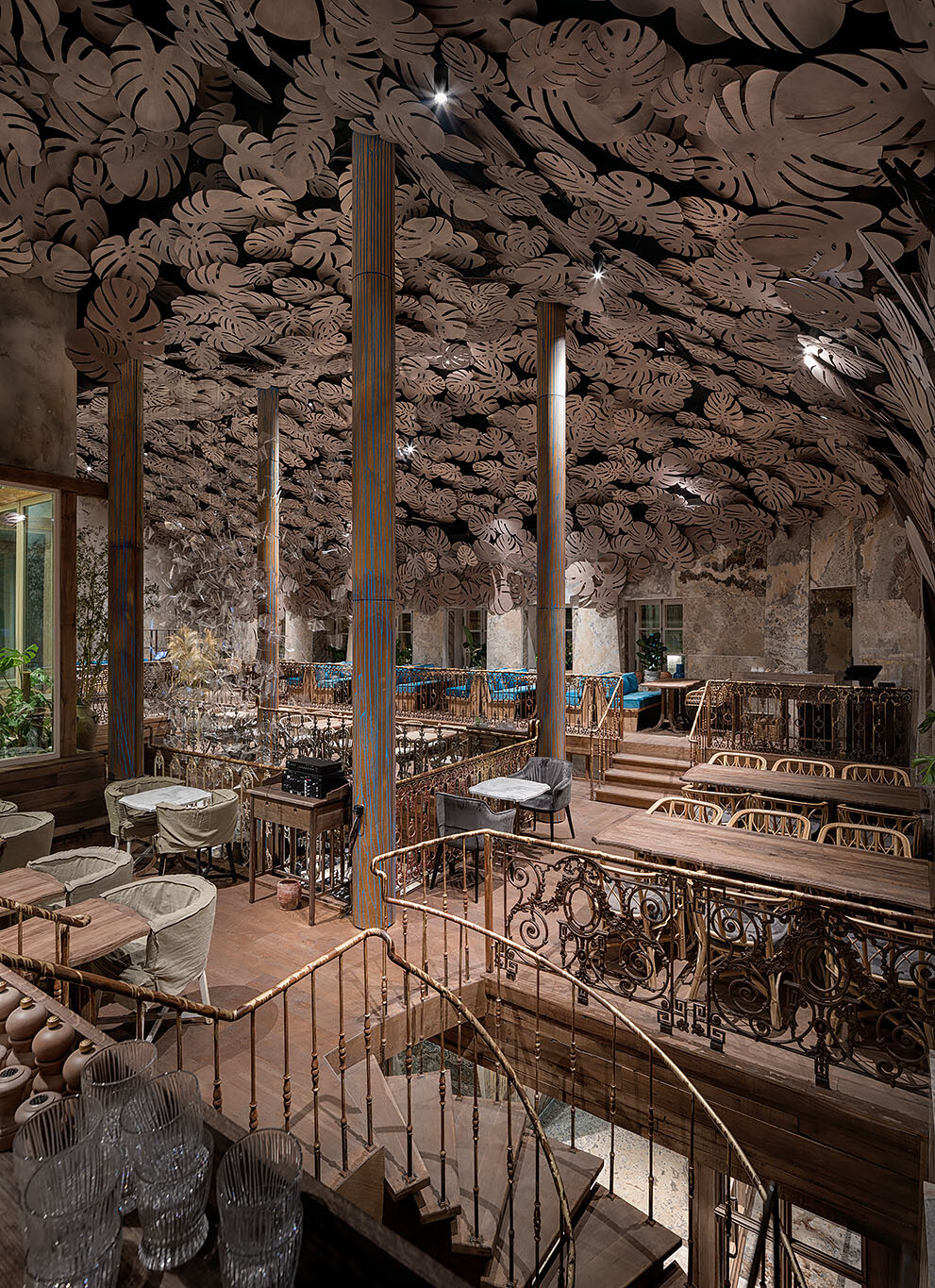 На першому поверсі розміщено квіткову крамницю та кав’ярню, але основна частина закладу — це просторе підвальне приміщення. Тож у підземній залі з баром зі стелі звисає коріння, що концептуально поєднує верхній та нижній поверхи. Це ніби корені рослин із квіткарні нагорі.