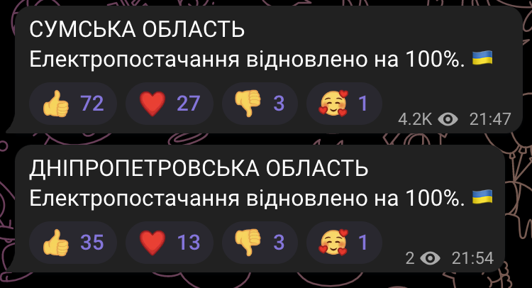 Заступник керівника Офісу Президента Кирило Тимошенко написав у своєму Telegram-каналі, що електропостачання на Сумщині та Дніпропетровщині відновлено на 100%.