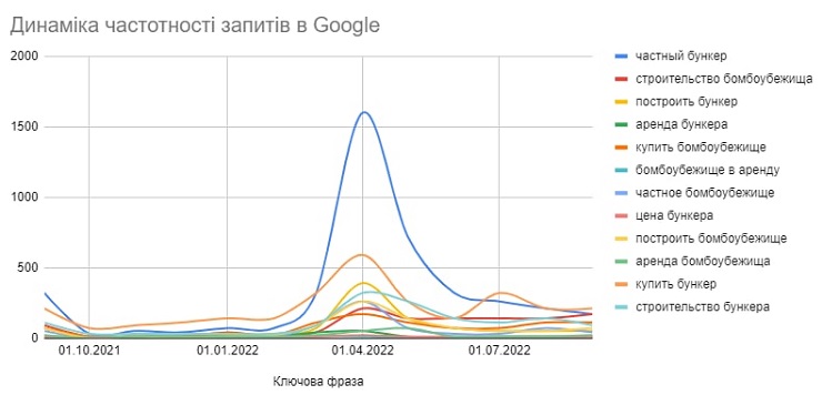 Кількість Google-запитів щодо бомбосховищ значно зросла. Якщо за січень запит «приватний бункер» загуглили лише 70 разів, то у квітні – вже 1600 разів. З квітня щомісяця кількість запитів стабільно спадала, хоча ще за неповний вересень досягнула показників вересня 2021-го.