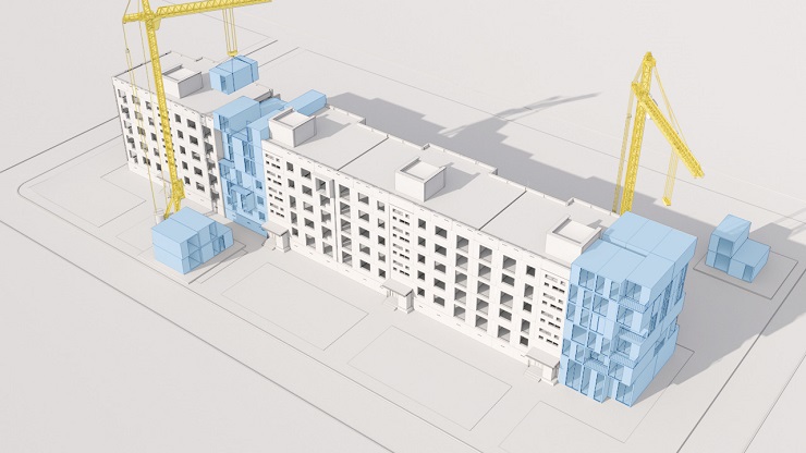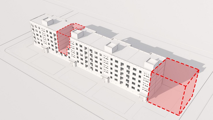 Якщо будинок зруйнований лише частково – заміна модуля буде відносно простою, адже тогочасна забудова є прикладом блокового будівництва. Комплексну відбудову зруйнованих будинків доведеться почати з розчистки знищених секцій. Після цього на їхнє місце накладають бетонні модулі. Під час монтажу конструкції вже матимуть вмонтовані інженерні комунікації – їх доведеться лише під’єднати до наявної інфраструктури будинку.