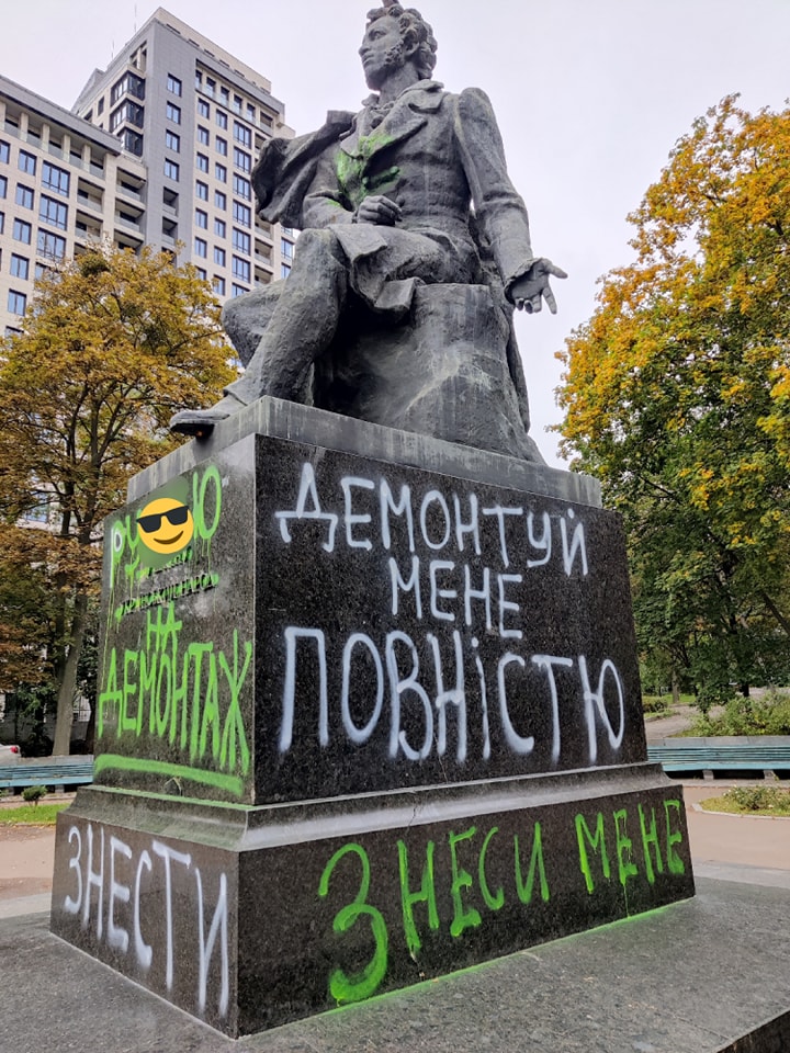 Також розмалювали пам’ятник Пушкіну на проспекті Перемоги. На ньому залишили написи «Знеси мене», «Русню на демонтаж».