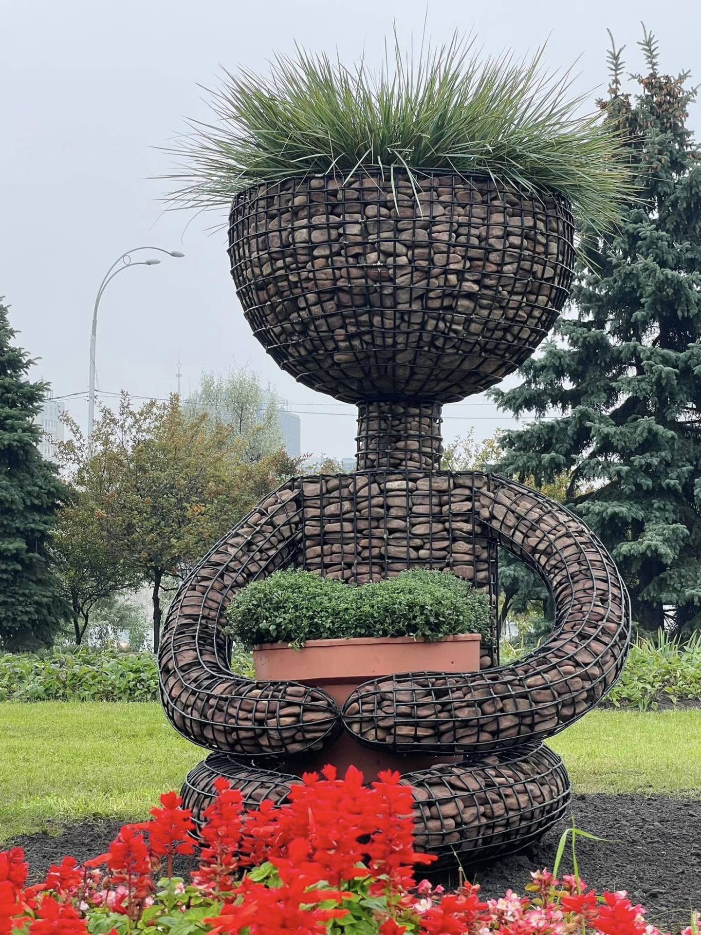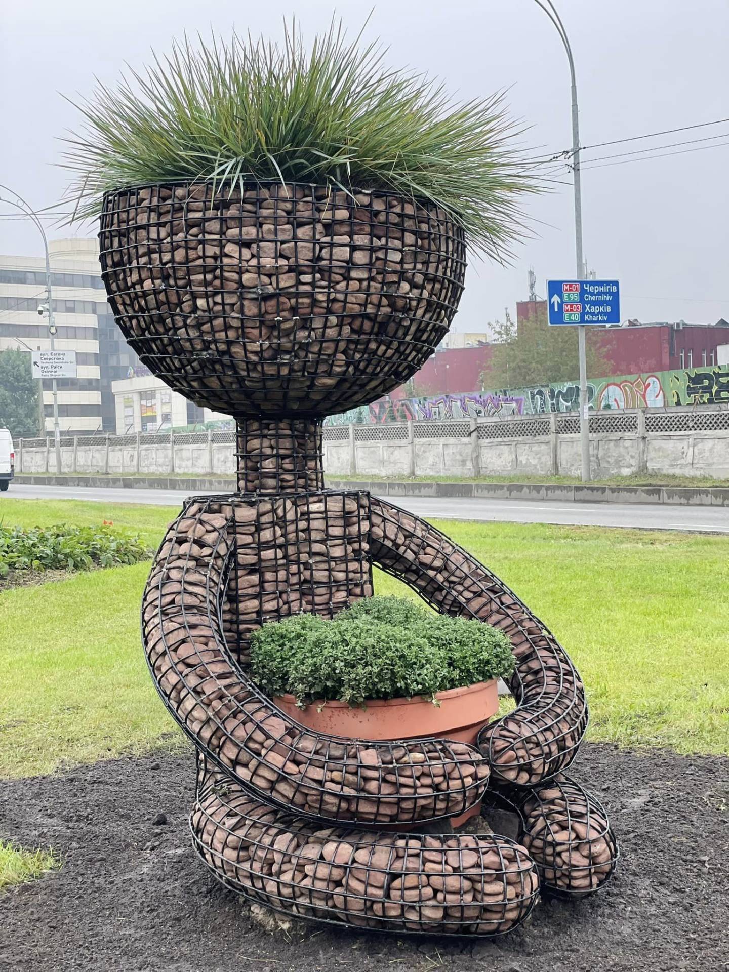 Габіон (сітчаста конструкція) є тримачем для рослин: у руках хлопчик тримає горщик з квітами, а з голови в нього проростає трава — елімус.