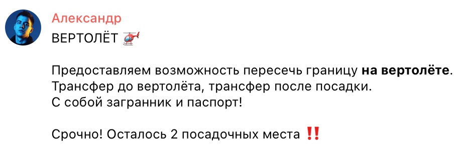 У головному телеграм-чаті черги на Верхньому Ларсі є навіть оголошення з пропозицією перетнути кордон на гелікоптері або на приватному літаку.