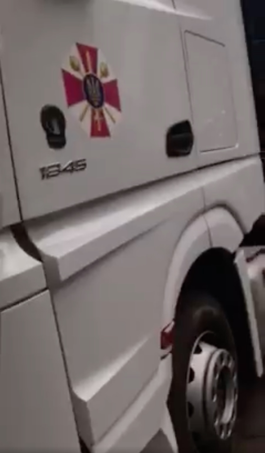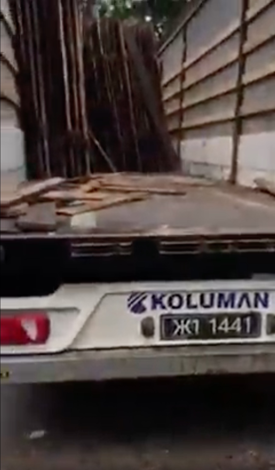 27 вересня забудовник підігнав КАМАЗ з наліпками ЗСУ та перепусткою Нацгвардії на лобовому склі. На причепі, за словами Бобрової, прикріплено фальшивий номер, під яким — російські номери, що вказують на те, що автівка може бути трофейною.
