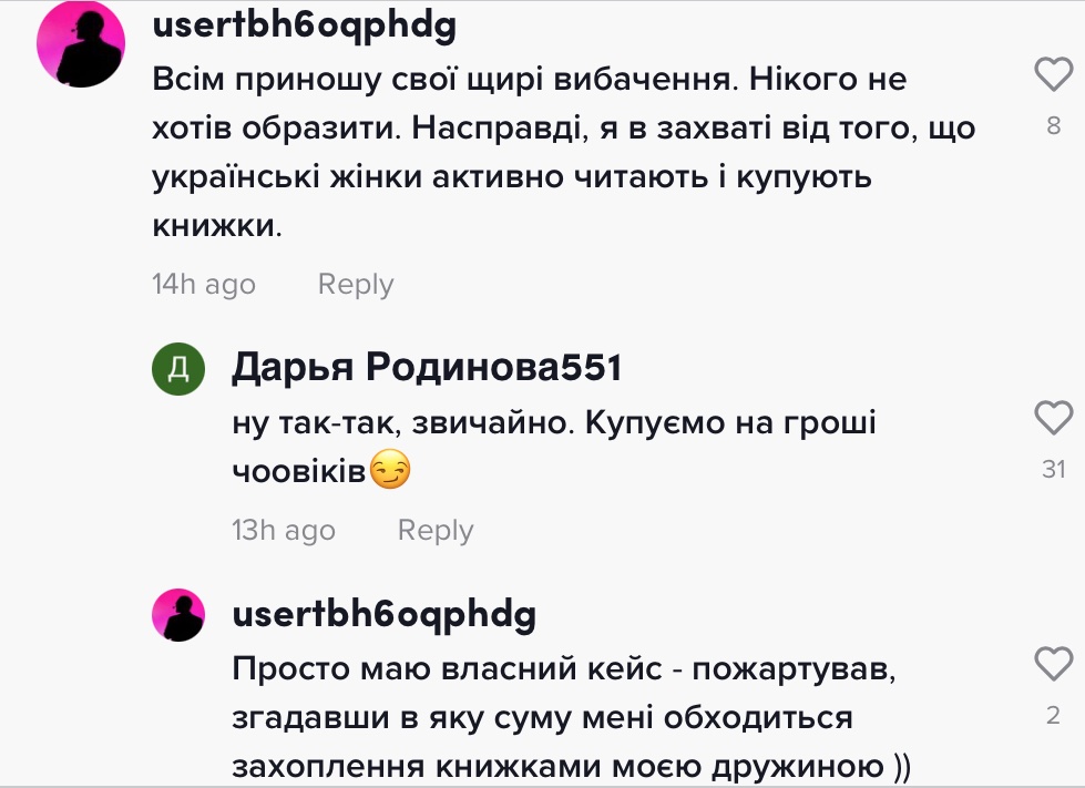 Спершу гендиректор обмежився кількома коментарями в гілках обговорень у фейсбуку та тіктоці. Зокрема, під відео TikTok-блогерки bezkhvosta.books він пояснив свій жарт тим, що нібито згадав, в яку суму йому обходиться захоплення дружини книжками.