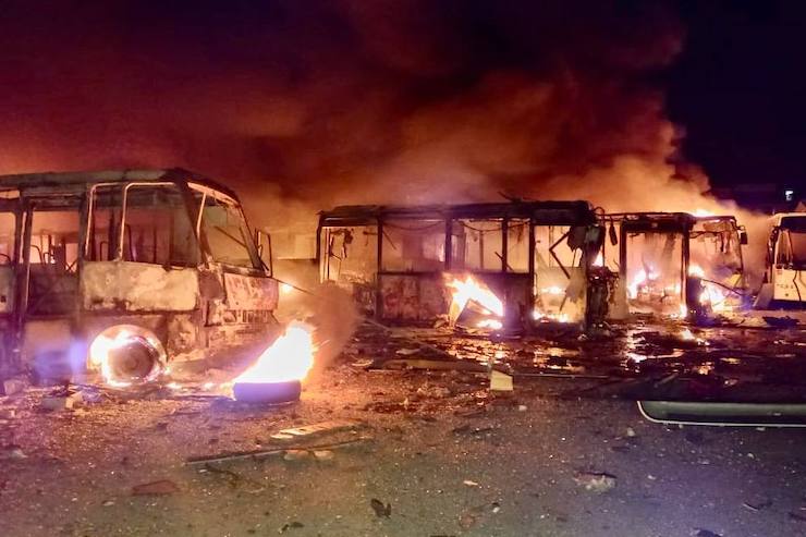 Влучили в транспортне депо, згоріли 52 автобуси, ще 98 пошкоджено. Повідомляється про одного загиблого та п’ятьої поранених. Також пошкоджено кілька багатоповерхівок, гімназія, магазин та адміністративні будівлі.