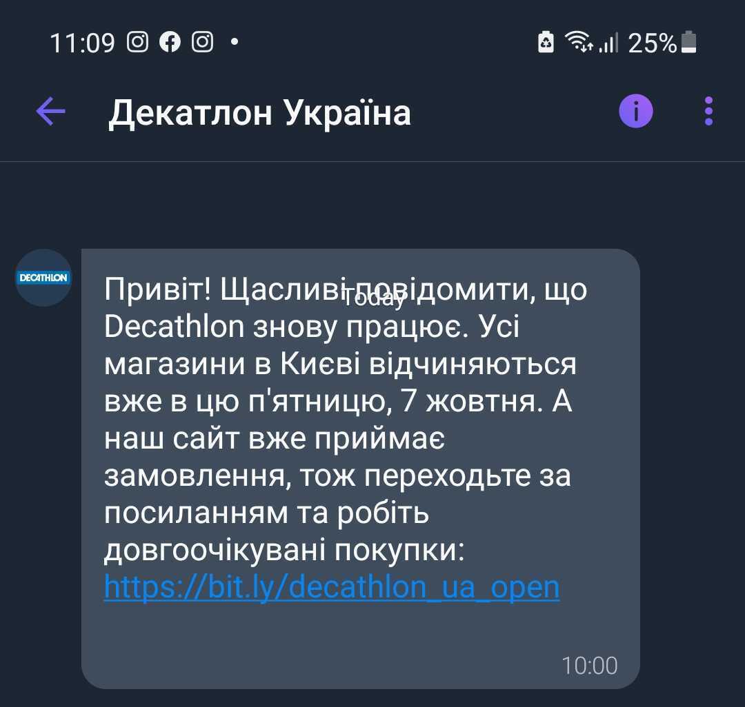 Цієї п’ятниці, сьомого жовтня, в Києві відновлять роботу всі магазини Decathlon — про це компанія повідомила клієнтам у месенджерах, а також підтвердила інформацію «Хмарочосу».