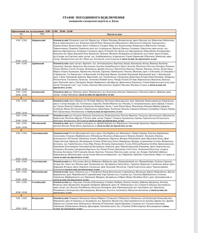 Світло виключатимуть у періоди з 8:00 до 12:00 та з 20:00 до 24:00.