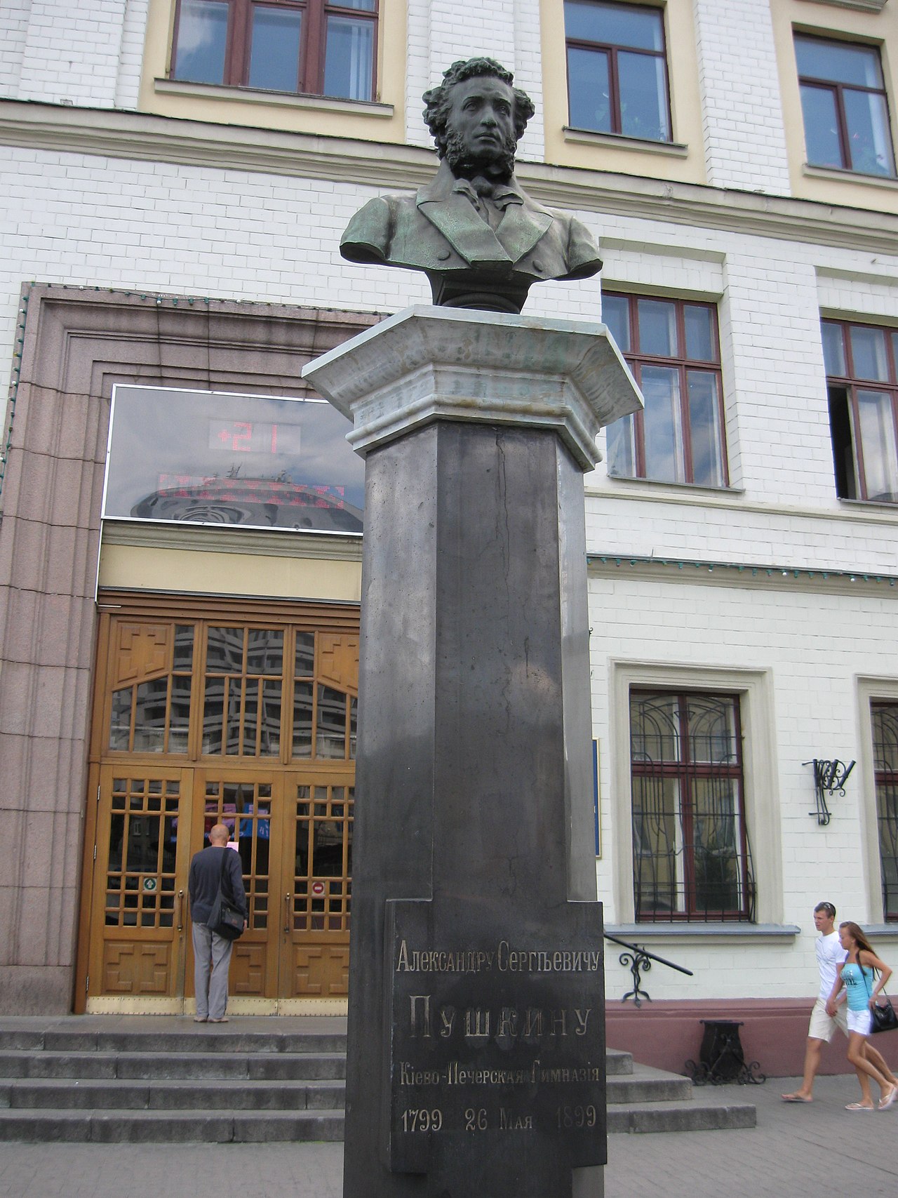 Це був найстаріший пам’ятник Пушкіну в Києві. Його встановили 1899 року викладачі й учні Києво-Печерської гімназії до сторіччя народження російського поета. Вони зібрали гроші та замовили погруддя у Петербурзі. Бюст створив Роберт Бах, автор скульптурних портретів Тараса Шевченка.