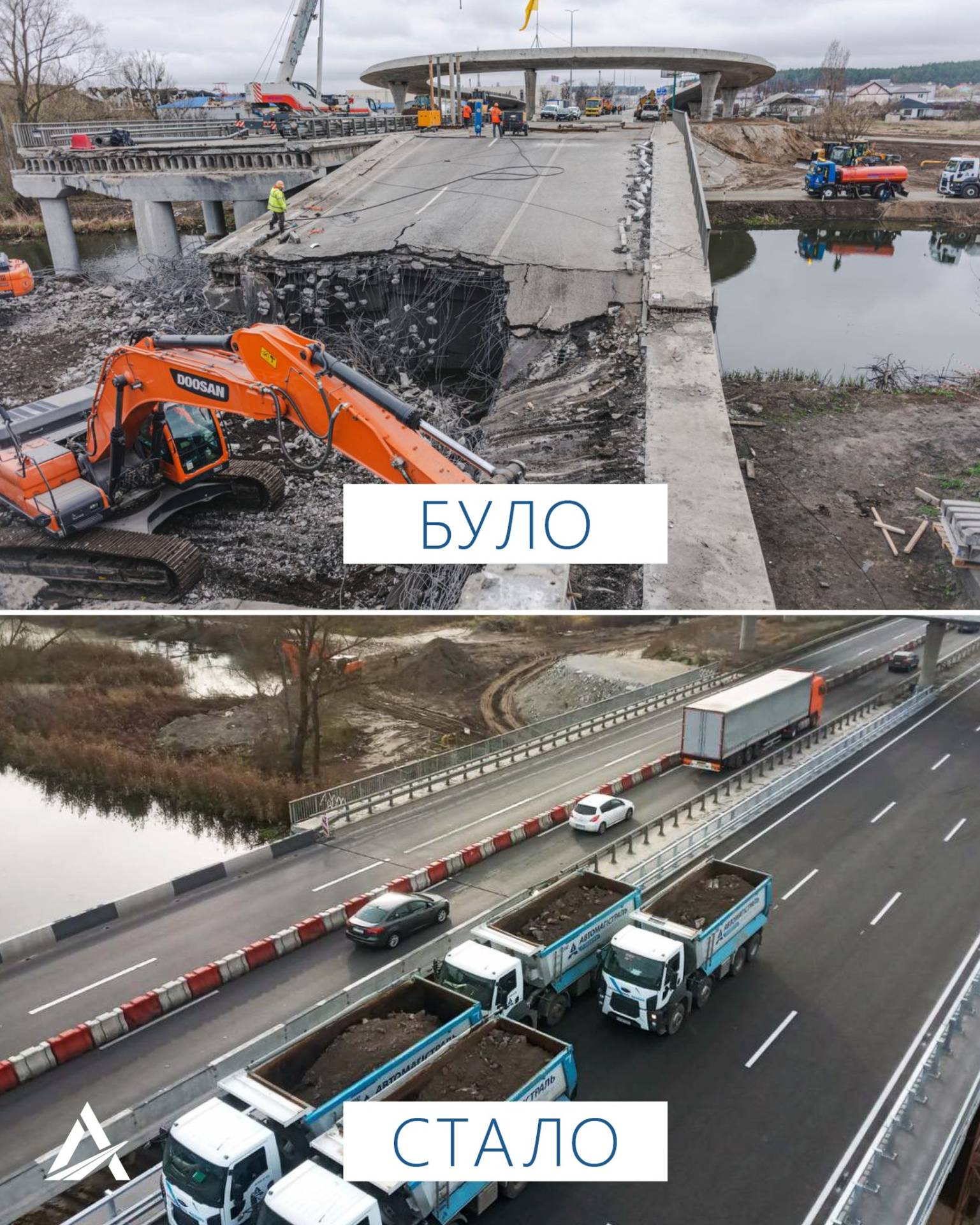 За два місяці на залишках старих конструкцій відновили лівий проїзд мосту. У травні відновили рух трасою М-06 для вантажівок і почали капітальну відбудову правої частини.