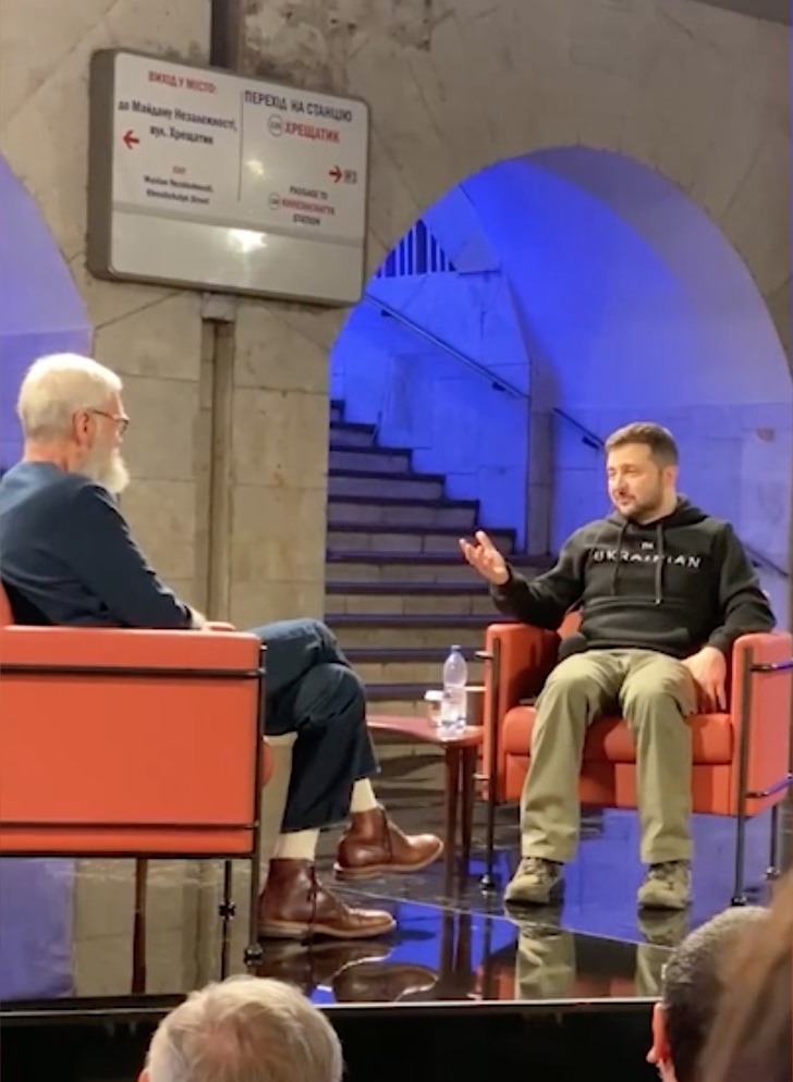 Посеред платформи метро встановили подіум, де вели бесіду Зеленський та Леттерман, а тим часом повз проїжджали потяги. Розклад метро для інтерв’ю не змінювали.