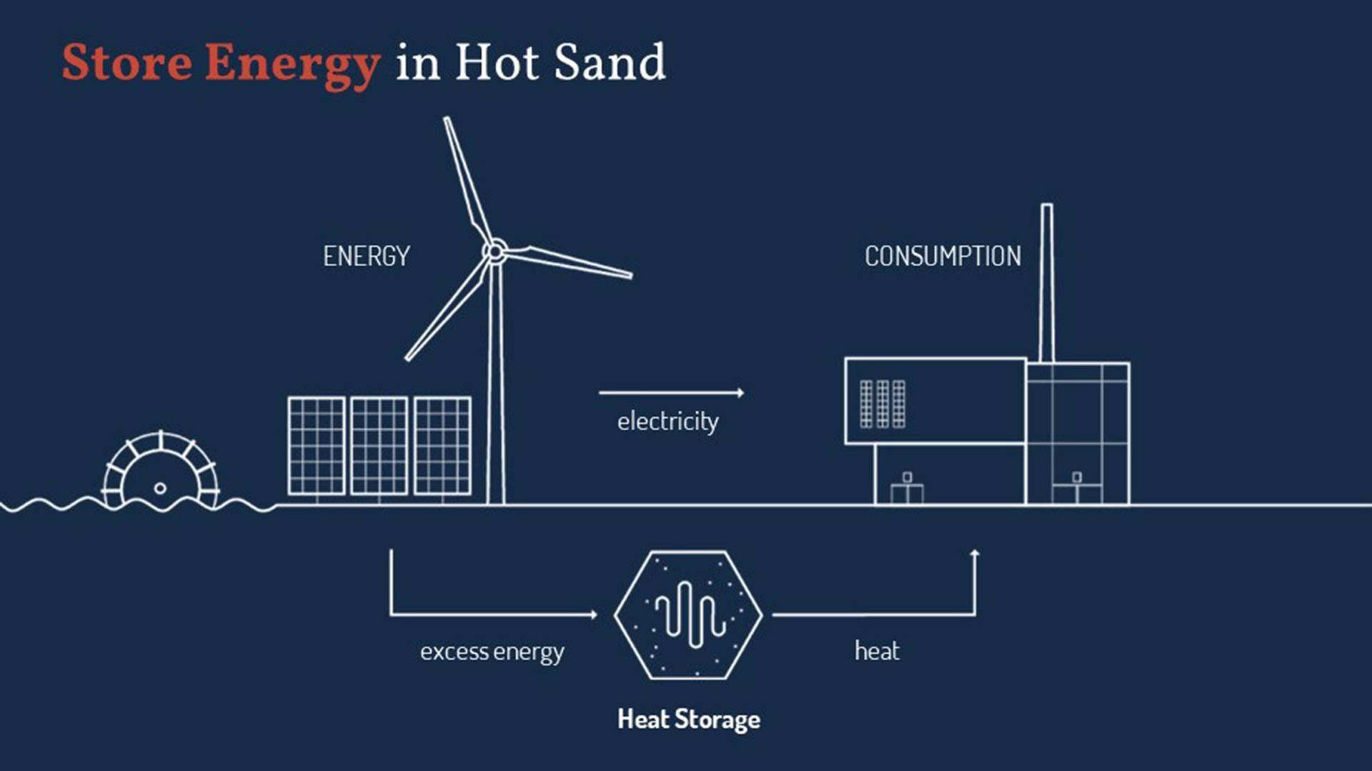 Пісок нагрівають до 600 градусів за Цельсієм за допомогою електроенергії, виробленої вітряними турбінами та сонячними батареями.
