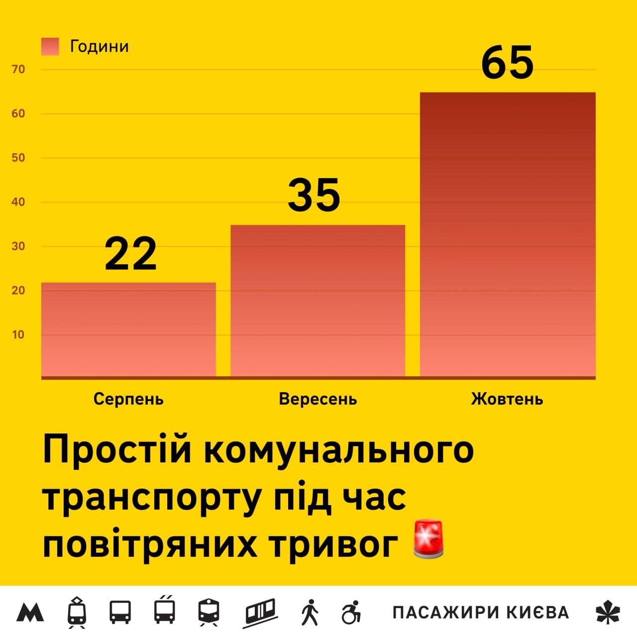 Від серпня громадський транспорт столиці простоював 122 години через вимушені зупинки під час повітряних тривог. Такі дані наводить об’єднання «Пасажири Києва».