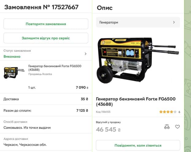 Попит на генератори на деяких українських маркетплейсах зріс у 20-30 разів. Так само зросли й ціни. Журналіст Віталій Червоненко помітив, що генератор, який він купував у 2015 році за 7 тисяч гривень, зараз коштує майже 47 тисяч і його немає в наявності.