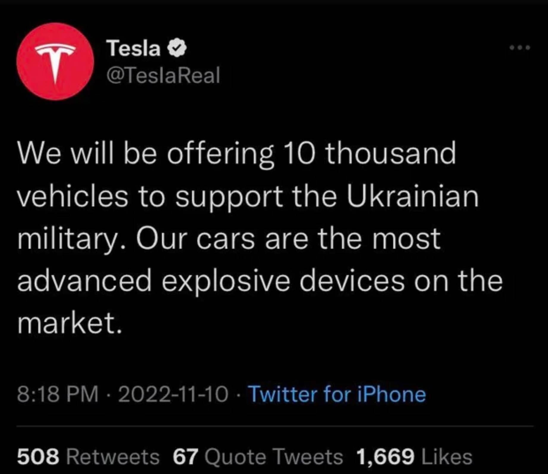 Один з фейкових акаунтів Tesla заявляє про постачання українській армії 10 тисяч електрокарів, бо вони «найпросунутіші вибухові засоби на ринку». Двійник профіля Nintendo публікує картинку з СуперМаріо, який показує середній палець.