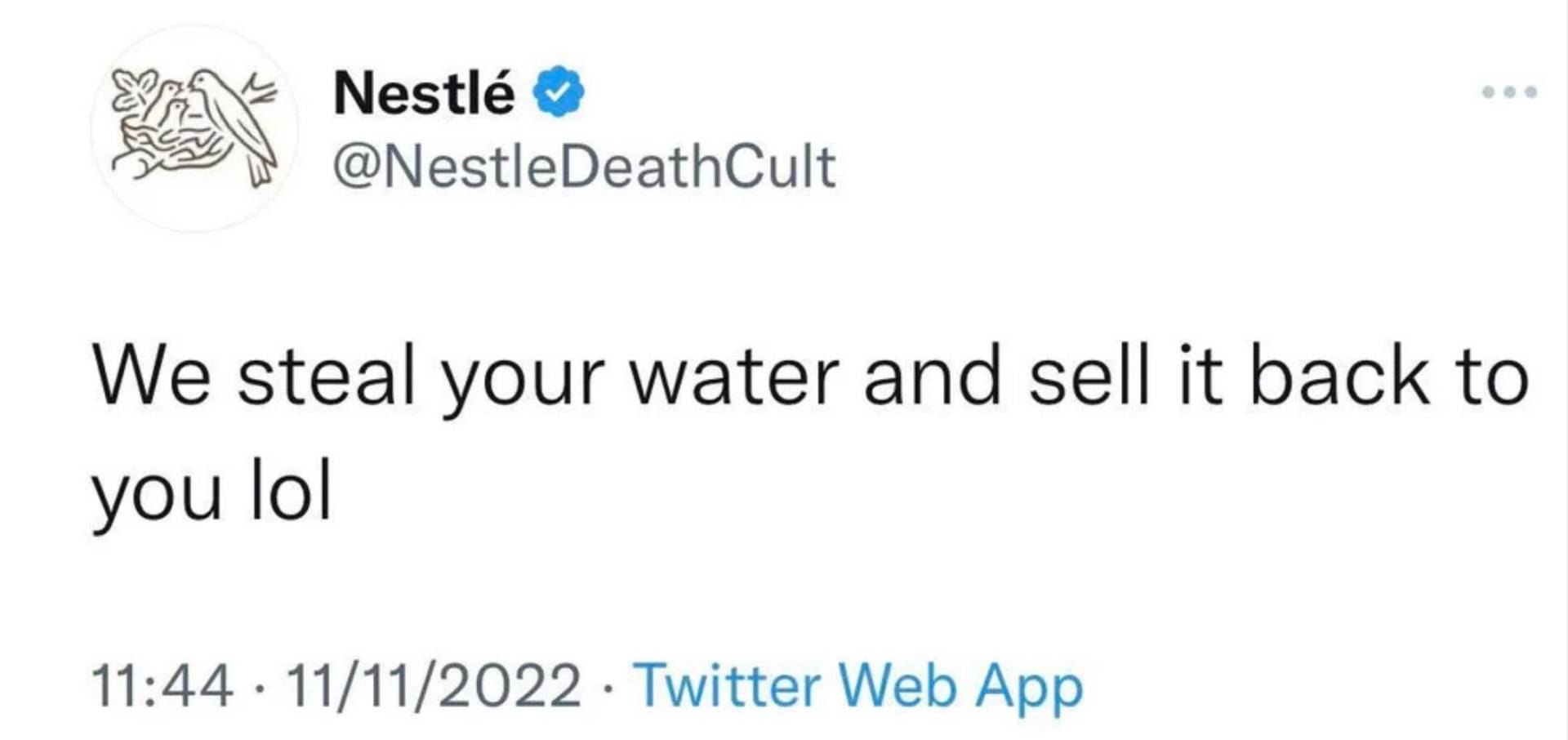 «Ми крадемо вашу воду та продаємо її вам ггг», — повідомляє «Nestle». «Я розлучаюся», — пише «Меланія Трамп».