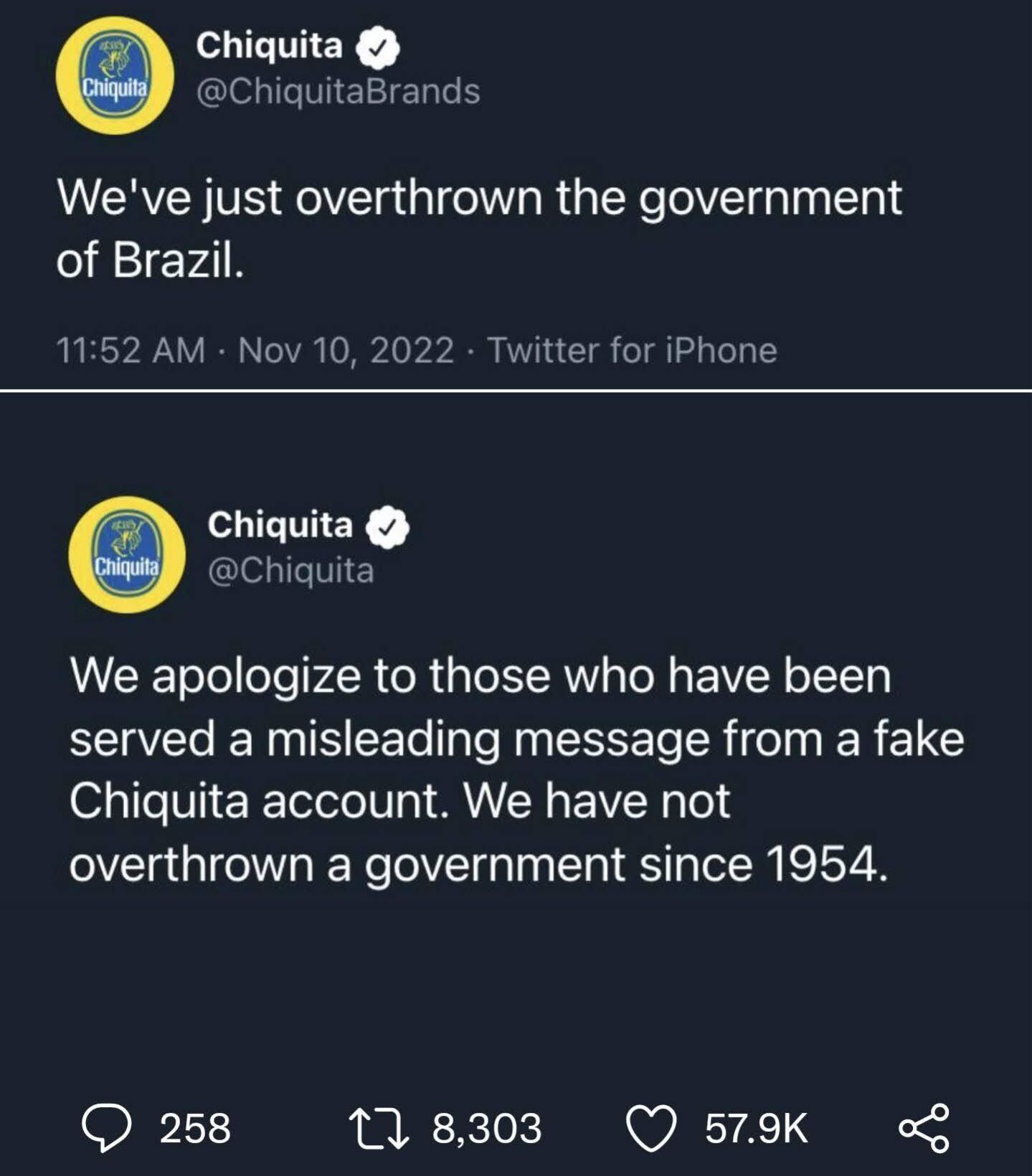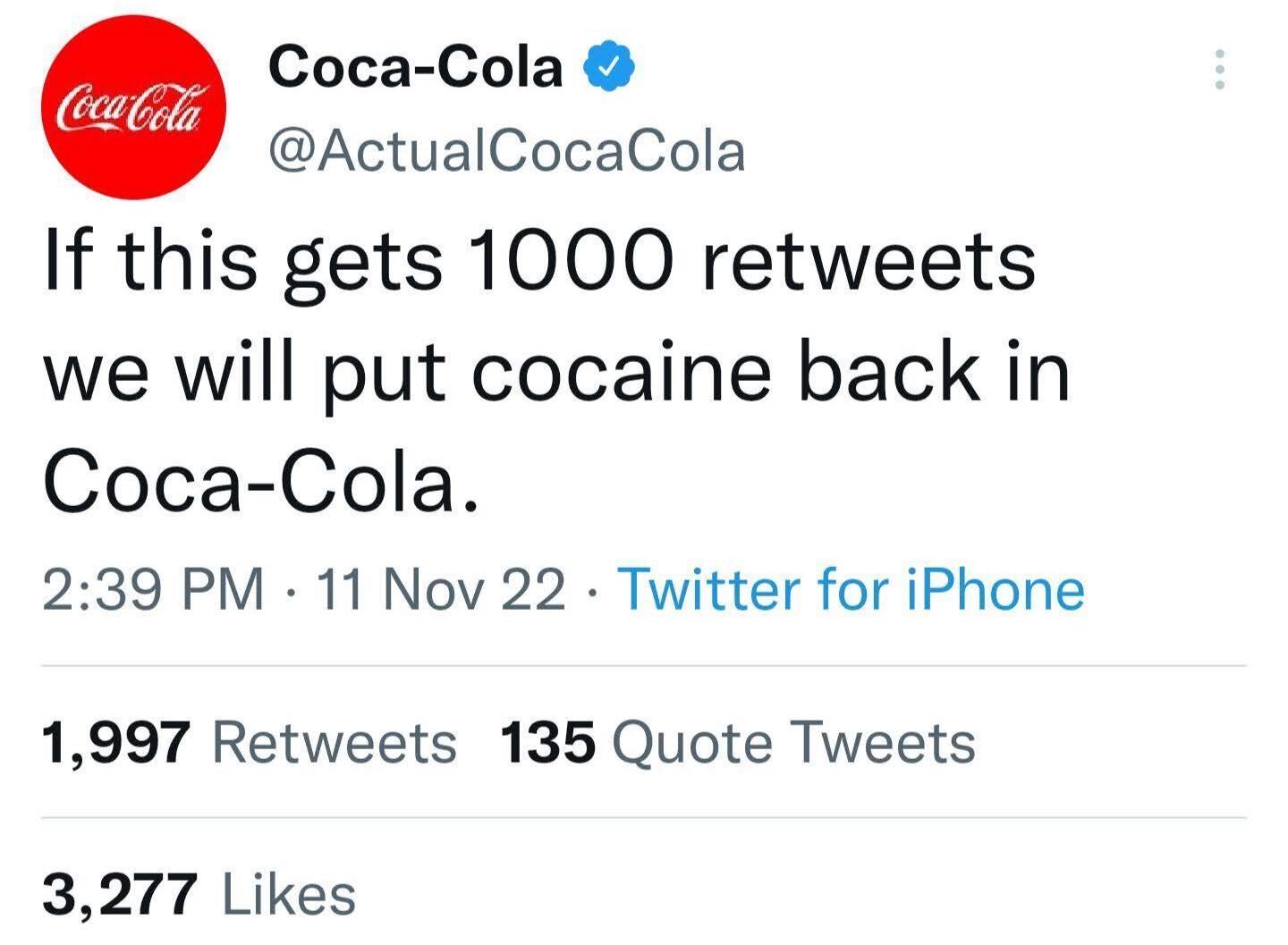 «Якщо цей твіт поширять 1000 разів, ми повернемо кокаїн у кока-колу», — така заява з’явилася на акаунті Coca-Cola з синьою галочкою.