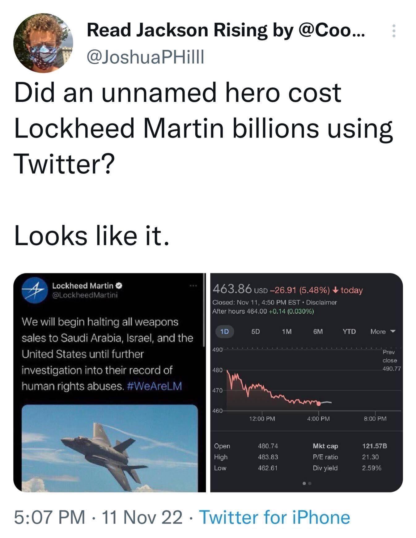 Така ж історія з авіакосмічною корпорацією Lockheed Martin. Твіт на акаунті-двійнику повідомляє про призупинення постачання зброї Саудівській Аравії.