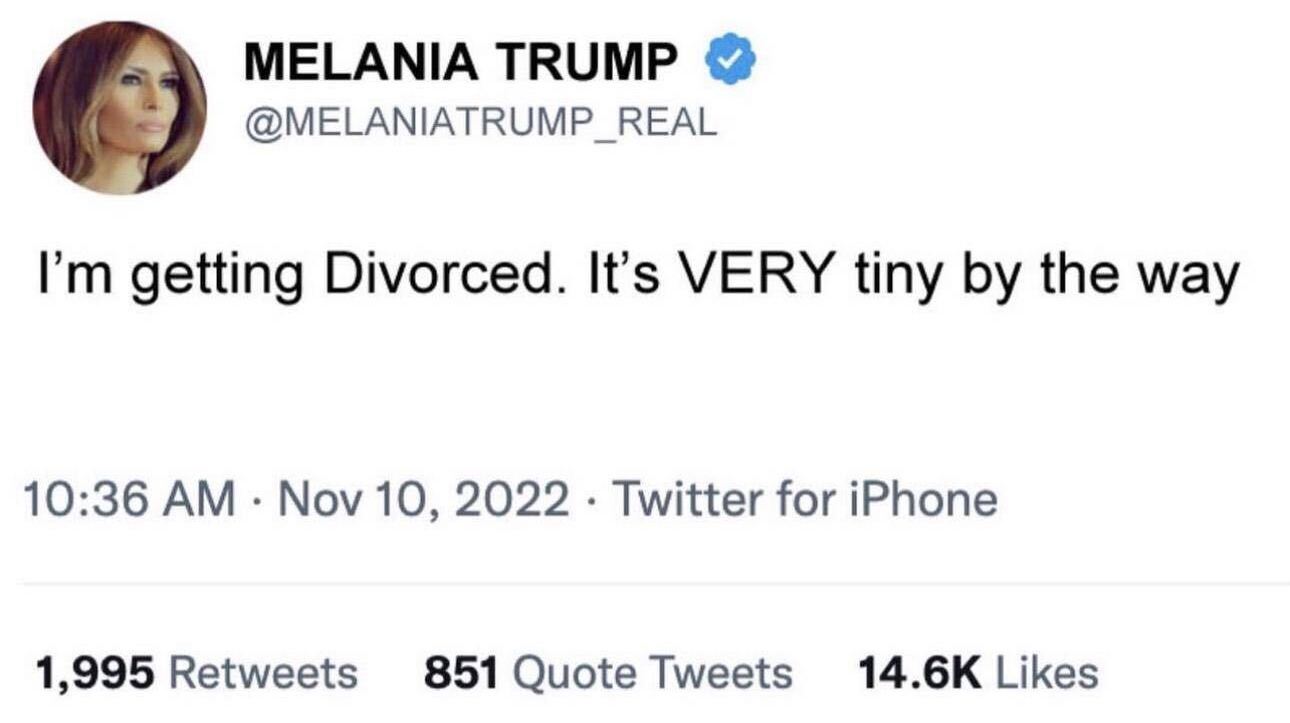 «Я розлучаюся. І, до речі, він у нього ДУЖЕ маленький», — пише «Меланія Трамп».