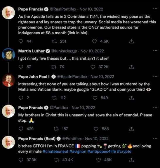 А це тред обміну коментарями між «папою Франциском», «Мартіном Лютером» і «папою Іваном Павлом ІІ». В кінці у чат заходить «СПРАВЖНІЙ папа Франциск» із реплікою: «Валіть усі нахер звідси, суки».