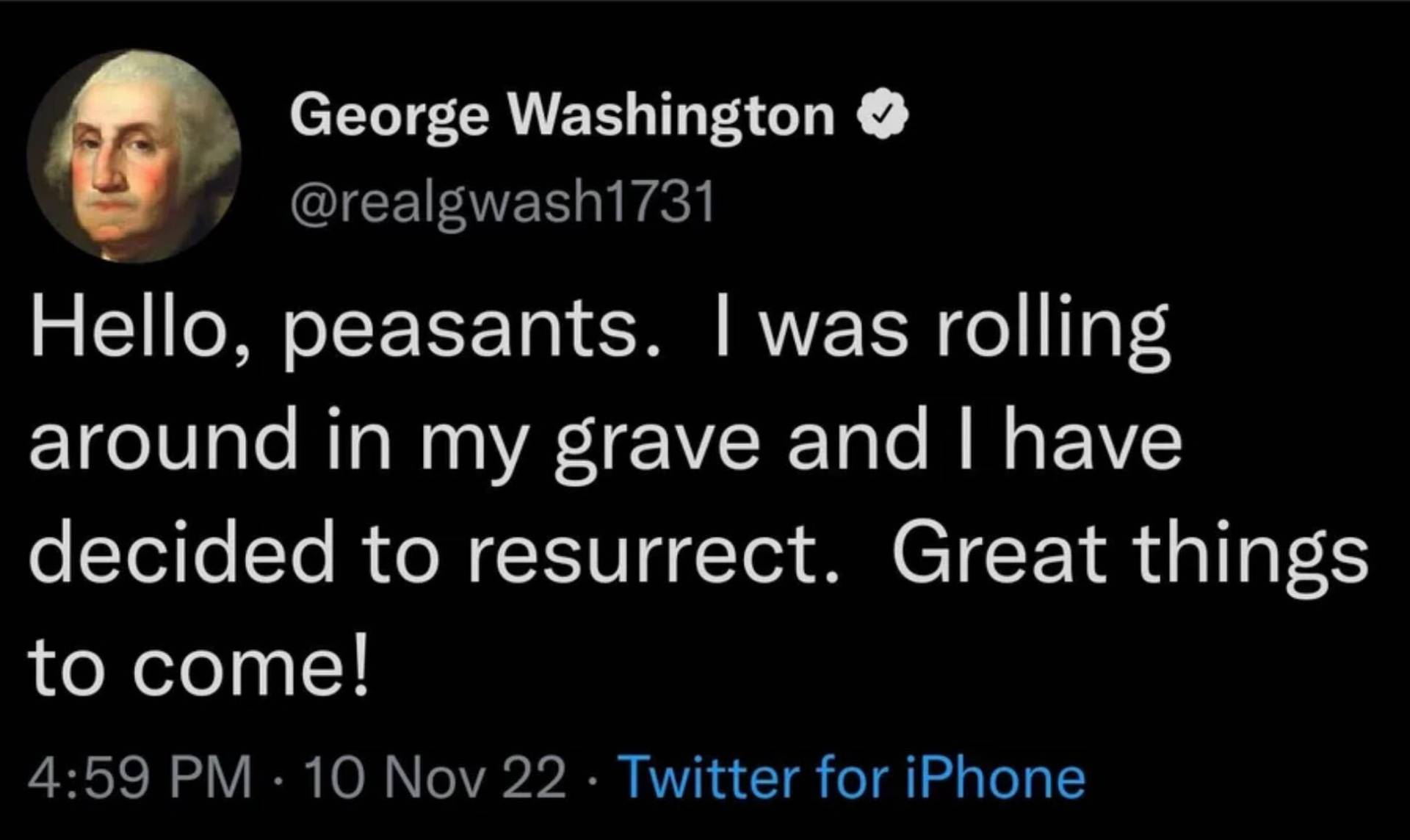 «Привіт, холопи. Я крутився в гробу й вирішив восстати. Чекайте на дещо неймовірне», пише «Джордж Вашингтон».