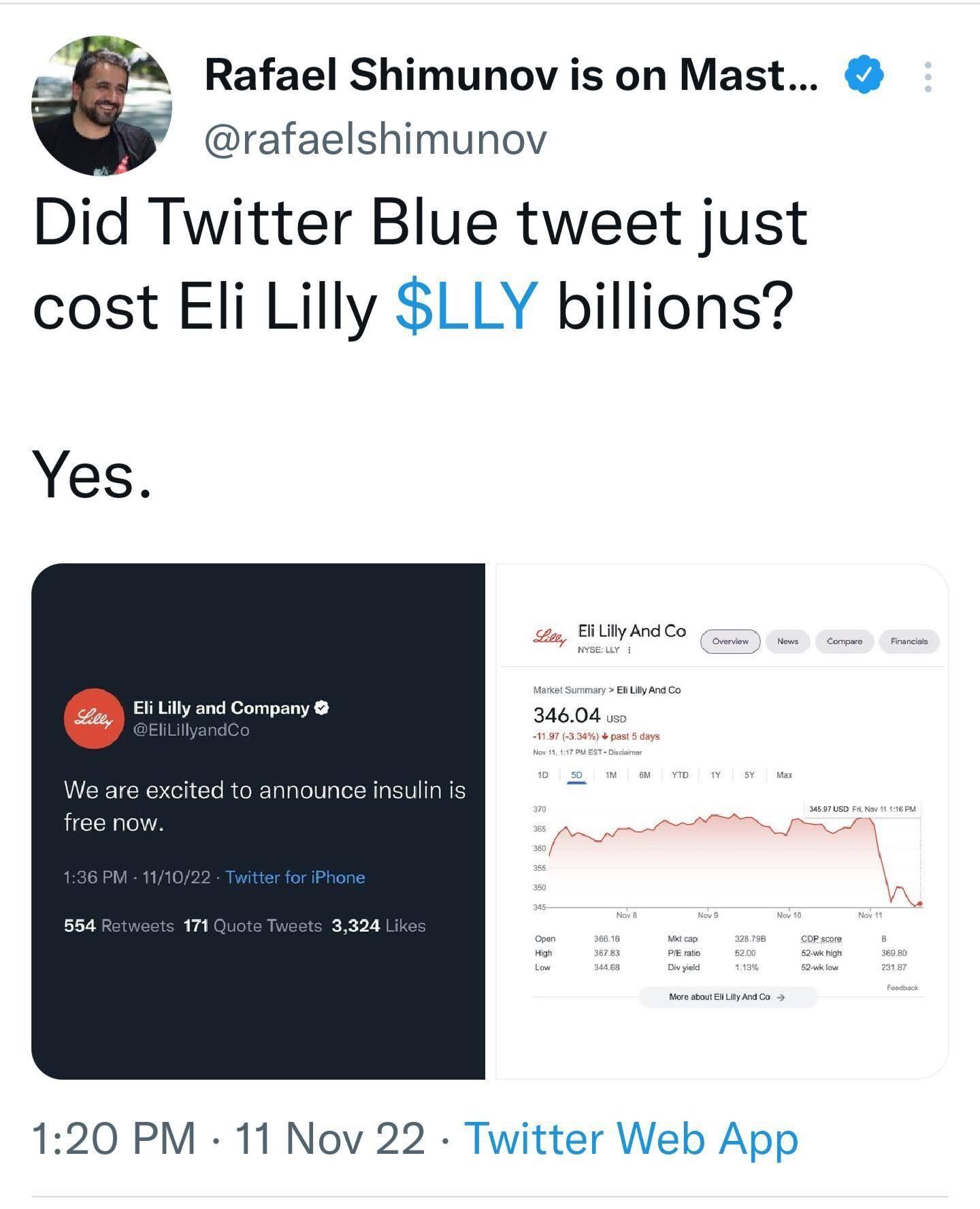 Так, двійник акаунта фармацевтичного гіганта Eli Lilly — з таким самим логотипом на картинці профілю та синьою галочкою — заявив, що відтепер інсулін буде безкоштовним. Протягом наступних годин акції компанії обвалилися. Незабаром інший двійник Eli Lilly вибачився за фейкове повідомлення та заявив, що відтепер інсулін здорожчає з 35 доларів до 400 доларів.