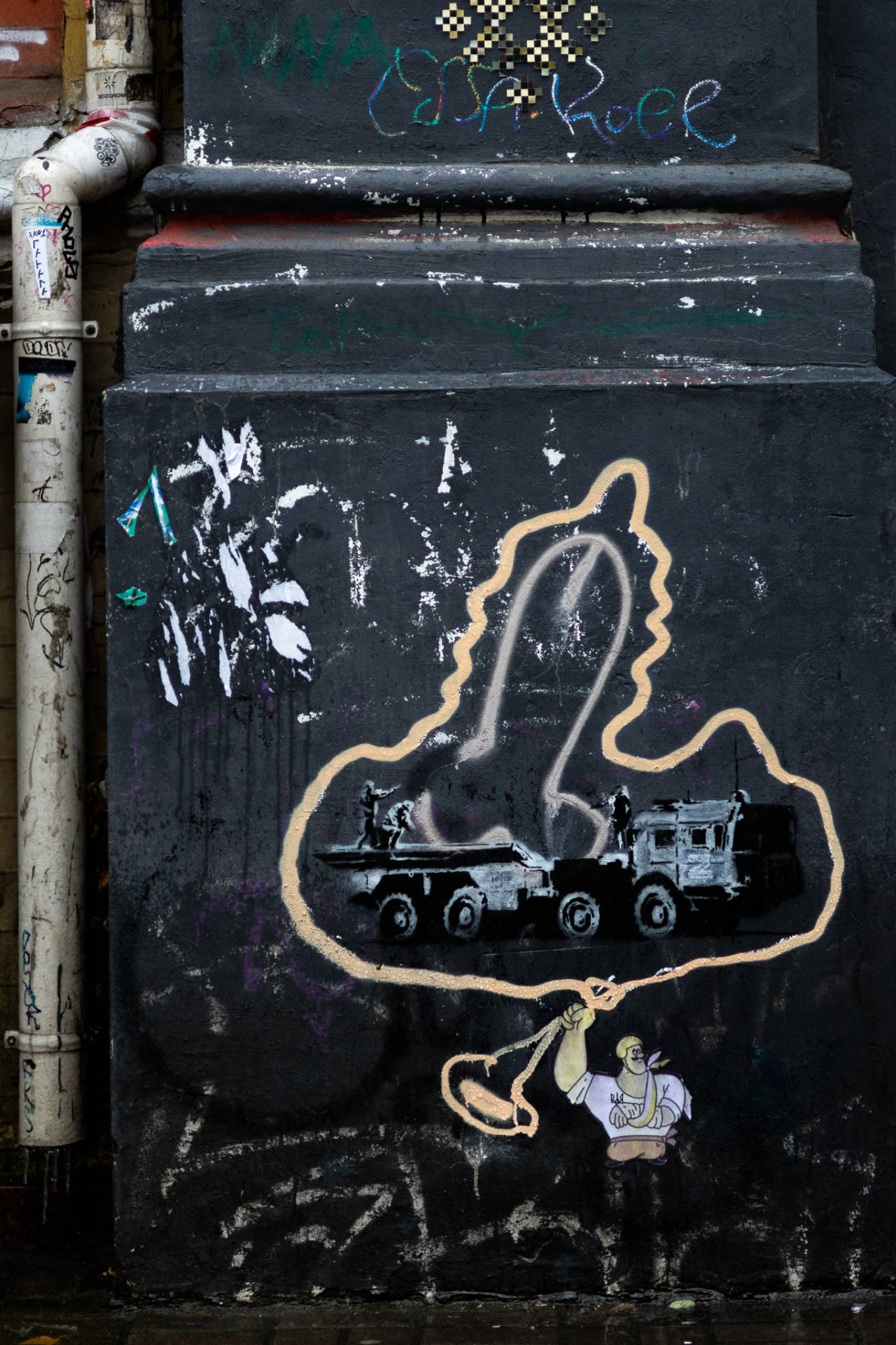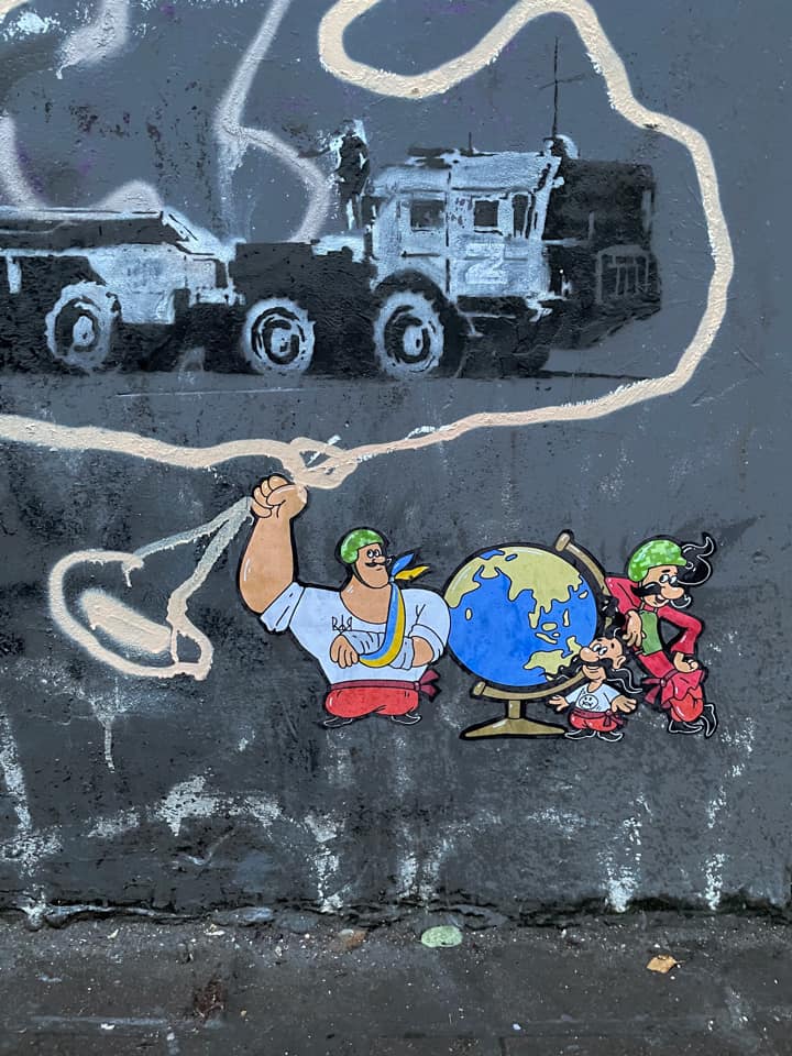 На стіні будинку на вулиці Великій Житомирській, 13 невідомим художником було намальовано пеніс. Бенксі інтегрував у вуличне графіті ракетну пускову установку з символом Z. Незабаром інші художники помістили «боєголовку-пеніс» у презерватив, який тримають герої мультфільму «Як козаки…»