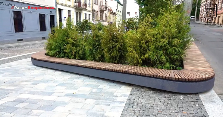 У рамках ремонту створили нову тролейбусну зупинку. Біля зупинкового комплексу розташували фонтан з питною водою, кашпо з деревами, місця для сидіння та велопарковку.