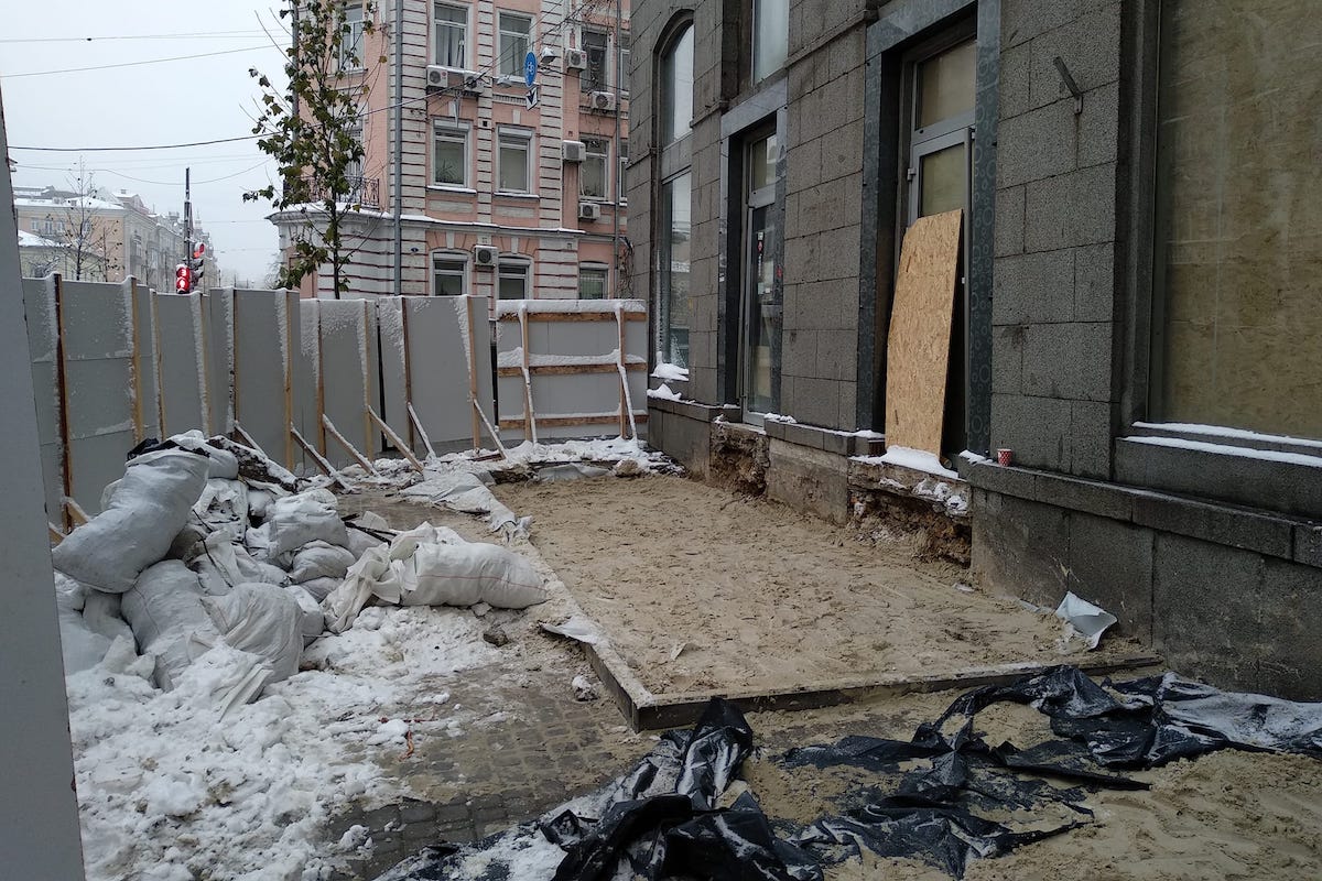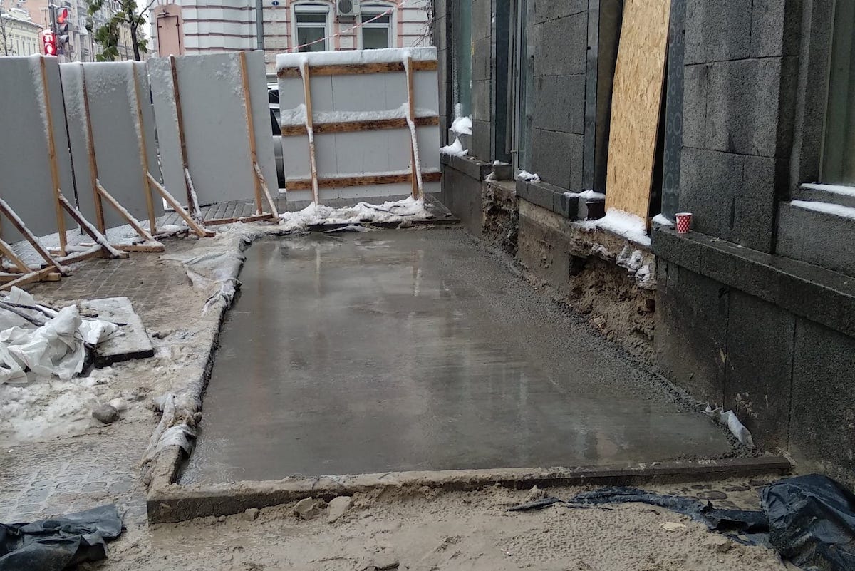 На розі Володимирської та Рейтарської, біля Софії Київської, працівники, винайняті закладом, залили бетоном нещодавну археологічну знахідку — підмурки споруди XVII–XVIII століть.