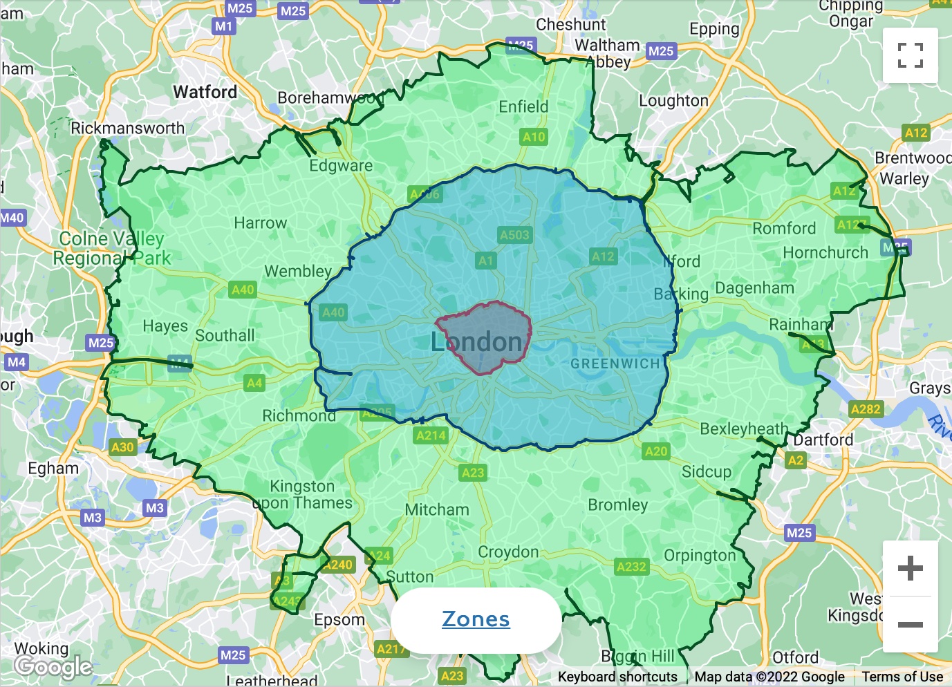 Мер Садік Хан запровадив зону низьких викидів у 2017 році. У цій зоні водії бензинових автівок, які не відповідають певним екологічним стандартам, мусять платити гроші. Торік площу ULEZ збільшили майже у 20 разів (на мапі позначено блакитним), а з наступного літа розширення стане ще масштабнішим (зелений колір на мапі).