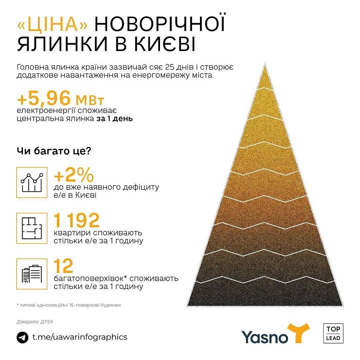 В інфографіці йшлося, що ялинка додасть ще два відсотки до енергетичного дефіциту столиці, 1192 квартири або 12 багатоповерхівок споживають стільки електроенергії за годину як ялинка за один день.