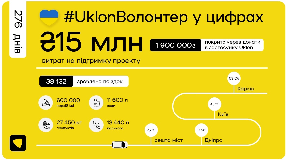 Від початку війни сервіс Uklon запустив окремий клас #UklonВолонтер, який допомагає волонтерам і працівникам критично важливої інфраструктури в шести містах — Києві, Одесі, Харкові, Миколаєві, Запоріжжі та Дніпрі.