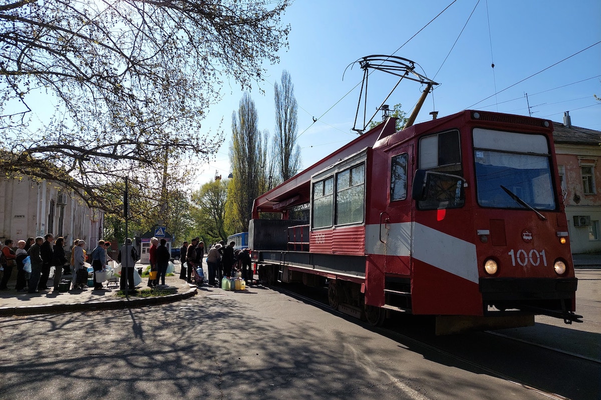 А ще воду розвозять тролейбус і вантажний трамвай-рельсовоз Миколаївелектротрансу. Трамвай виходить з депо на гуманітарний маршрут о 7:40 ранку.