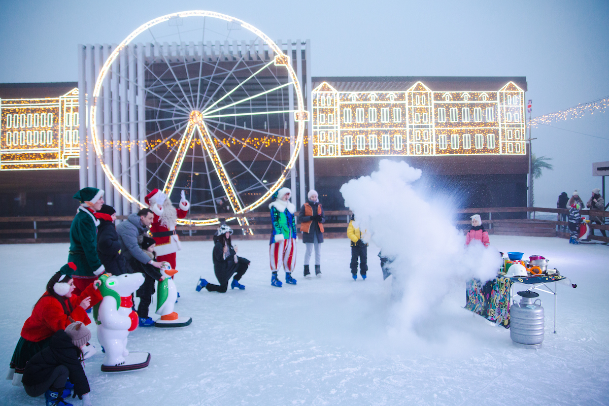 Від 17:00 на льодову арену виходитимуть фігуристи та виконуватимуть фаєр-шоу, акробатичні виступи та номери в неонових костюмах. Глядачі зможуть перебувати на льоду під час цих номерів.