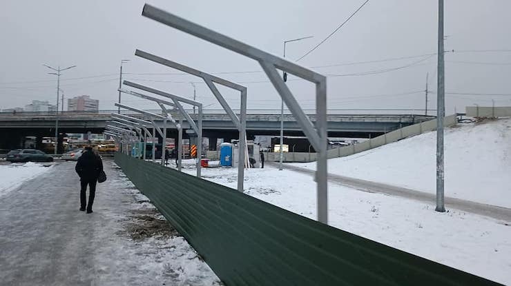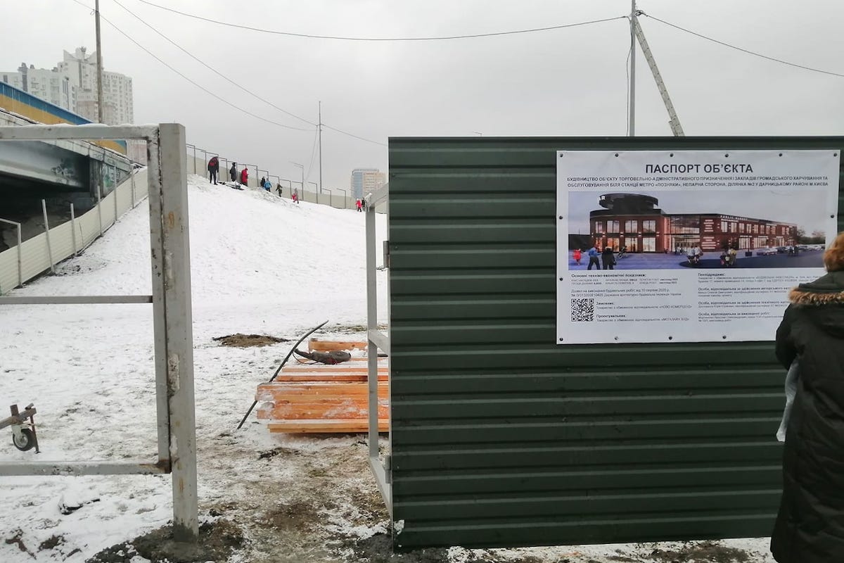 Поряд зі станцією київського метро «Позняки» забудовник встановив будівельний паркан, огородивши ділянку для будівництва торговельного центру.