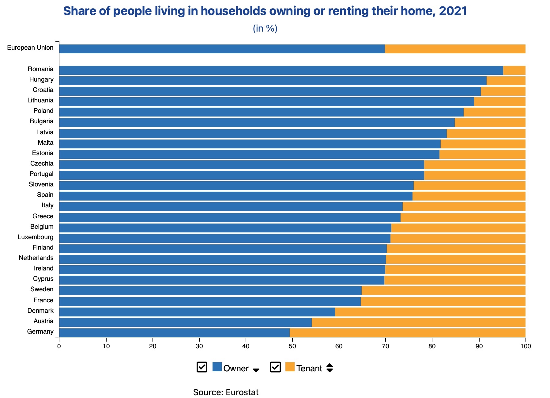 Загалом єдина країна ЄС, де частка винаймачів перевищує частку власників, — Німеччина, 50,5% орендарів. Також живуть в орендованих помешканнях майже 46% жителів Австрії, майже 41% — Данії, понад 35% — у Франції та Швеції.