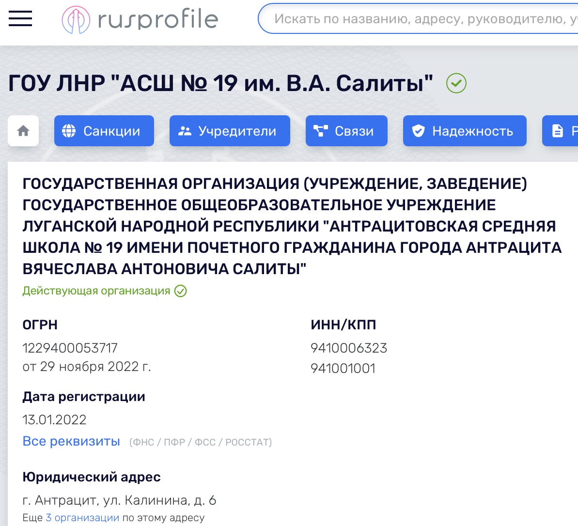 Середня школа №19 в окупованому місті Антрацит, Луганська область, зараз названа на честь колишнього мера міста В’ячеслава Саліти, який помер від тортур у 2014 році. На це звернув увагу журналіст Денис Казанський.