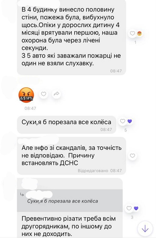 У сусідському чаті пишуть, що рятувальники ДСНС приїхали приблизно за 15 хвилин. Водночас спецтранспорту заважали проїхати припарковані автомобілі. Як стверджують мешканці, до власників авто так і не змогли додзвонитися – вони не брали слухавку.