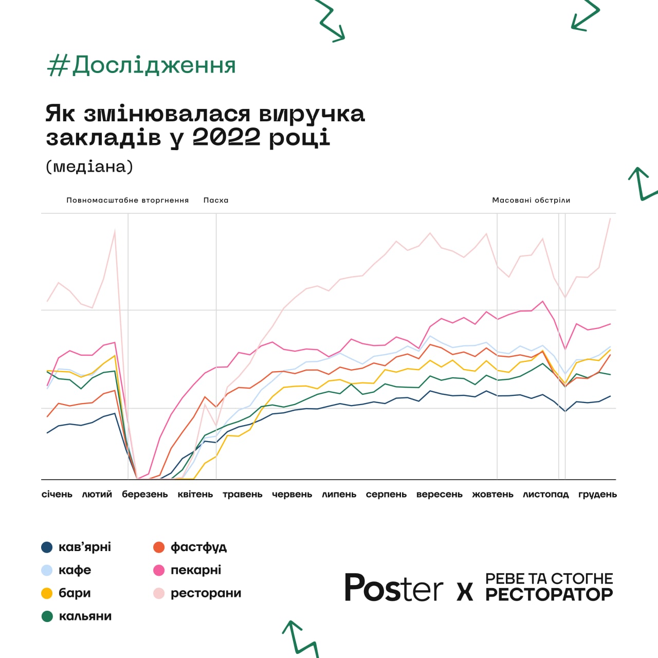Перші два тижні після початку вторгнення ресторани та кафе взагалі не отримували виторгу. Першим оговталися фастфуд, кав’ярні та пекарні й уже до кінця травня вийшли на довоєнні показники. Показники барів, ресторанів і кальянних повернулися до довоєнних лише у жовтні та листопаді.
