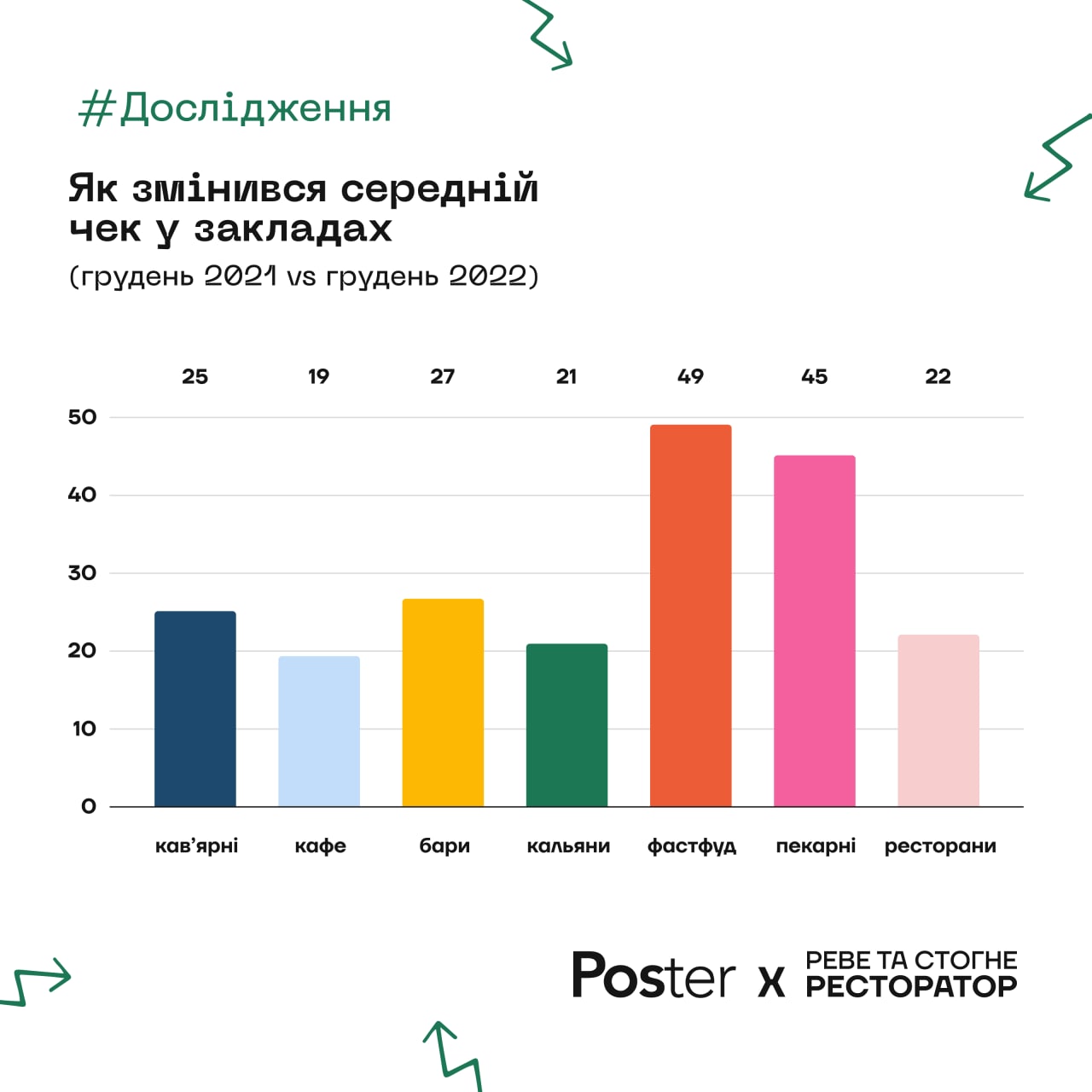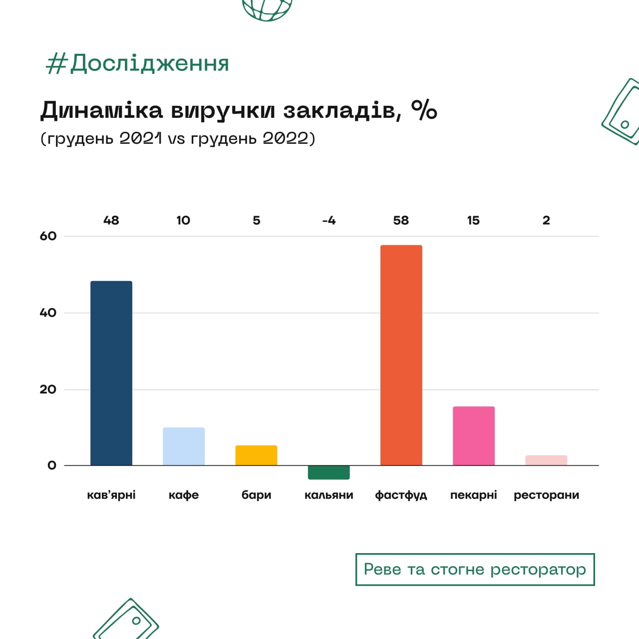 На передсвятковому тижні 19-25 грудня найбільше зріс виторг у фастфудів і кав’ярнь — приблизно на 50% до минулого року. Пекарні наростили оберти на 15%, бари на 5%, ресторани — на 2%, водночас кальянні «просіли» на 4%.