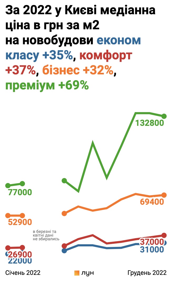 Квадратний метр комфорт-класу коштує в середньому 37 тисячі гривень, що на 37% дорожче, ніж торік. У Львові — 38,3 тисячі, що дорожче на 60%. Більш як у півтора раза зросли ціни в Ужгороді, Івано-Франківську та Одесі.