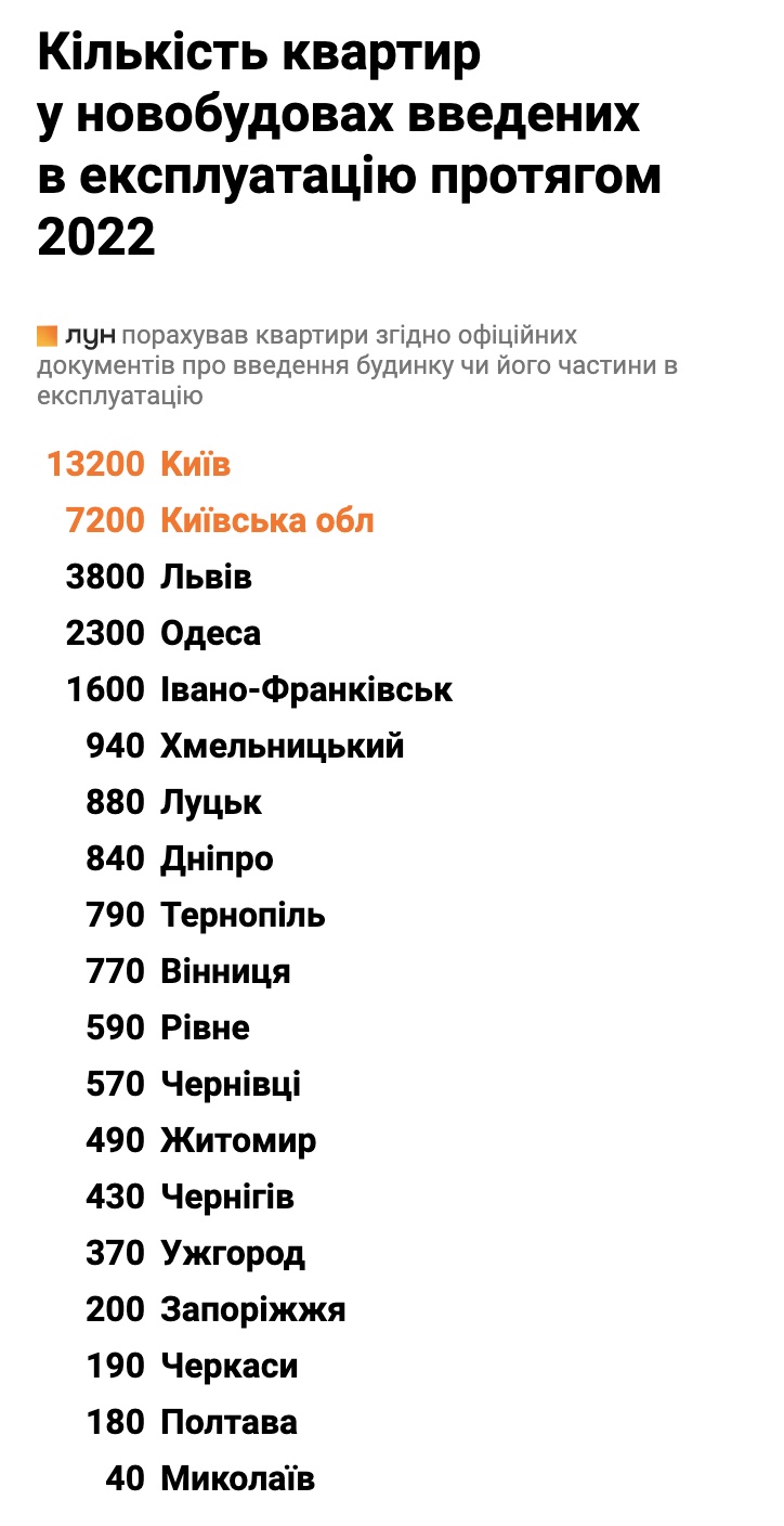 За 2021 рік загалом в Україні було введено в експлуатацію понад 11 мільйонів квадратних метрів житла, що було абсолютним рекордом за часи незалежності. За три квартали 2022 року забудовники почали будувати 68 тисяч нових квартир, що приблизно вдвічі менше, ніж минулого року.