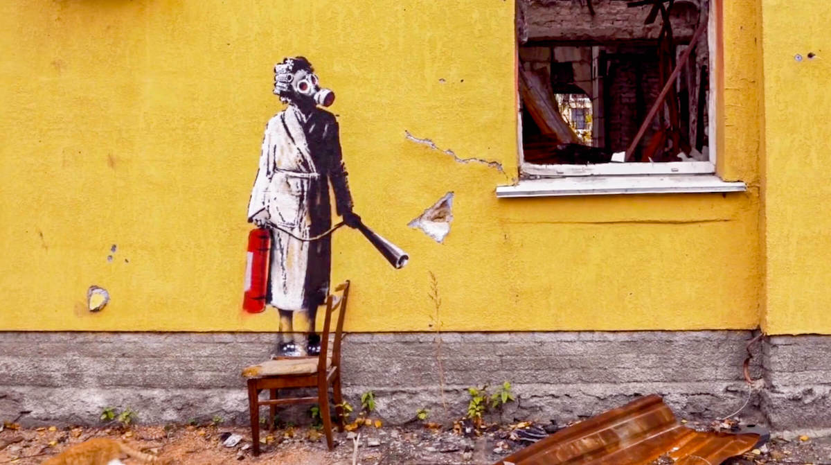 Графіті Бенксі у Гостомелі, початок листопада 2022 року. Скріншот з відео