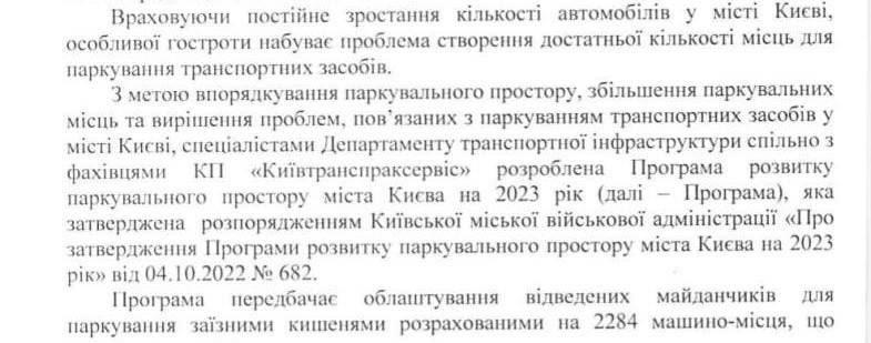 Дептранс посилається на необхідність реалізації Програми розвитку паркувального простору міста Києва на 2023 рік. Цей документ, стверджують Пасажири Києва, ховають від громадськості.