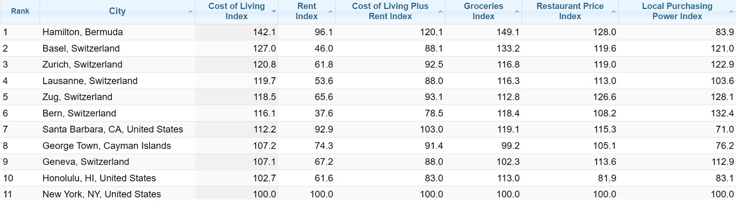 Найдорожче жити в таких містах: Гамільтон (Бермудські острови), Базель (Швейцарія), Цюрих (Швейцарія), Лозанна (Швейцарія), Цуг (Швейцарія), Берн (Швейцарія), Санта-Барбара (Каліфорнія, США), Джорджтаун (Кайманові острови), Женева (Швейцарія), Гонолулу (Гаваї, США).