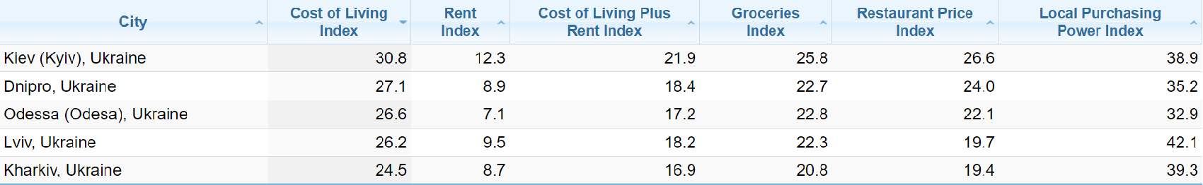 Київ посів 471 місце з 540 – індекс вартості життя тут складає 30,8. Індекс орендної плати – 12,3, ціни на споживчі товари з орендною платою – 21,9, ціни на продукти – 25,8, ціни в ресторанах – 26,6, купівельна спроможність – 38,9.