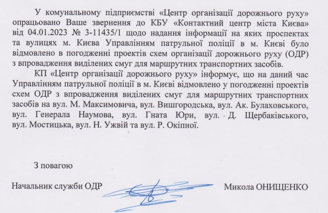 Так, відмовлено в облаштуванні смуг для автобусів на вулицях Максимовича, Вишгородська, Булаховського, Генерала Наумова, Гната Юри, Данила Щербаківського, Мостицька, Наталії Ужвій та Раїси Окіпної.