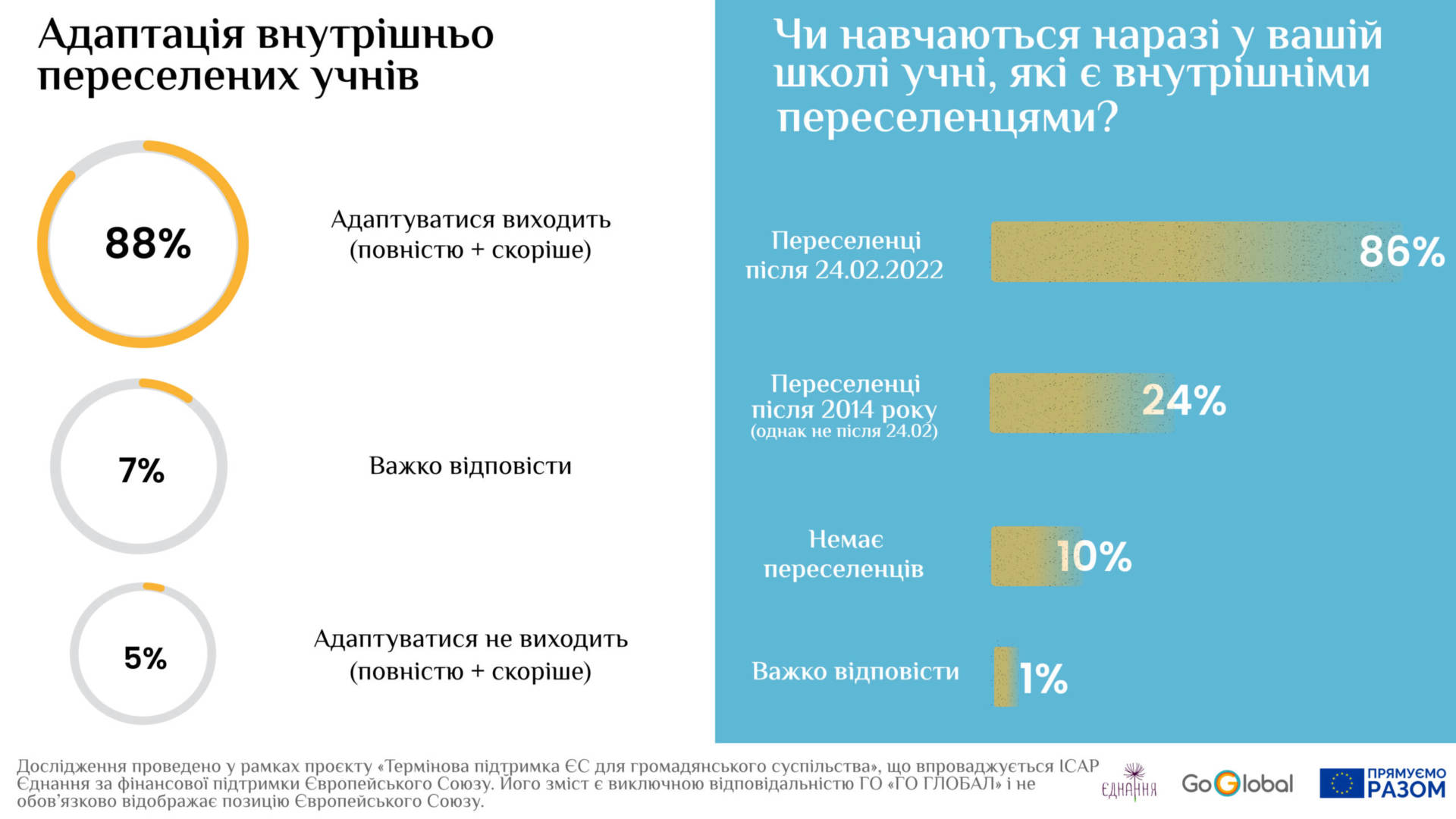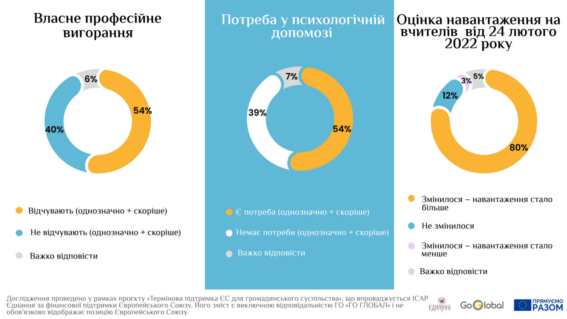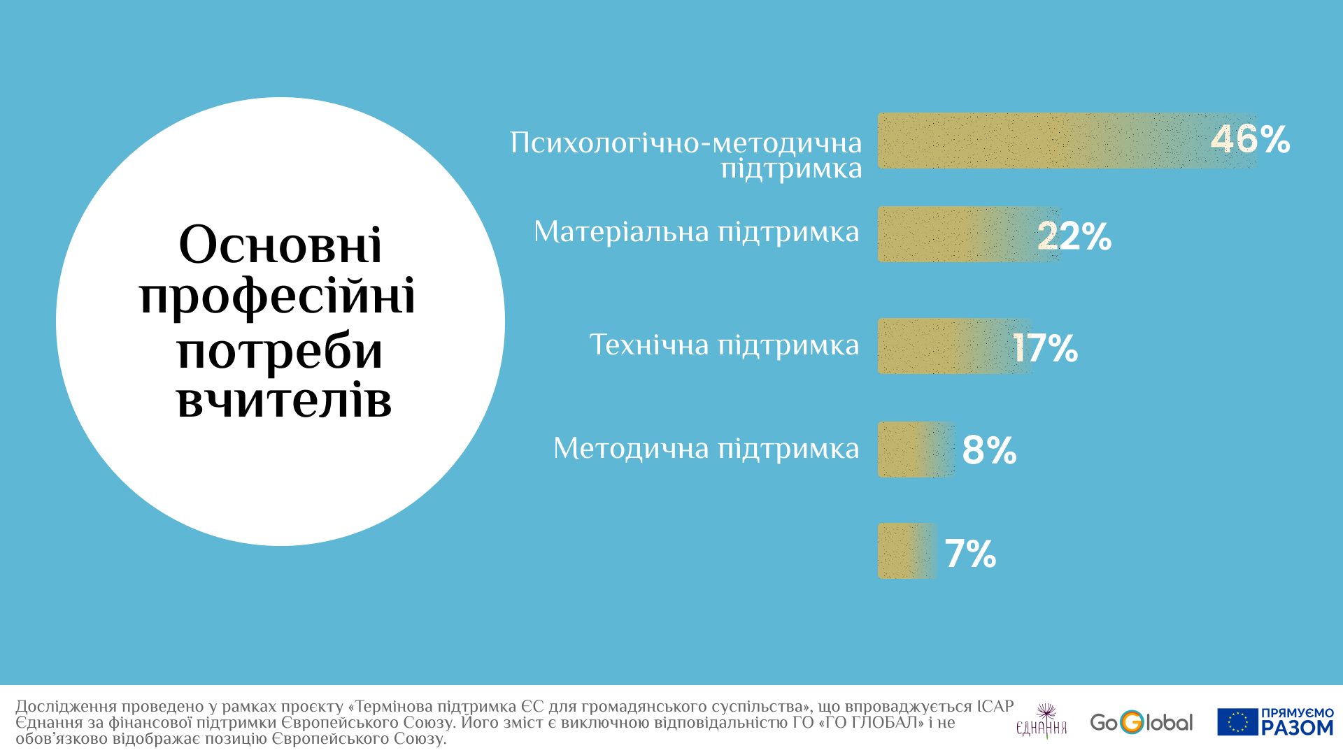 У стресі перебувають і самі освітяни: 80% опитаних говорять про зростання завантаженості. 54% відчували на собі стан професійного вигорання. 46% вчителів визначили психологічну підтримку потребою номер один для власної школи.