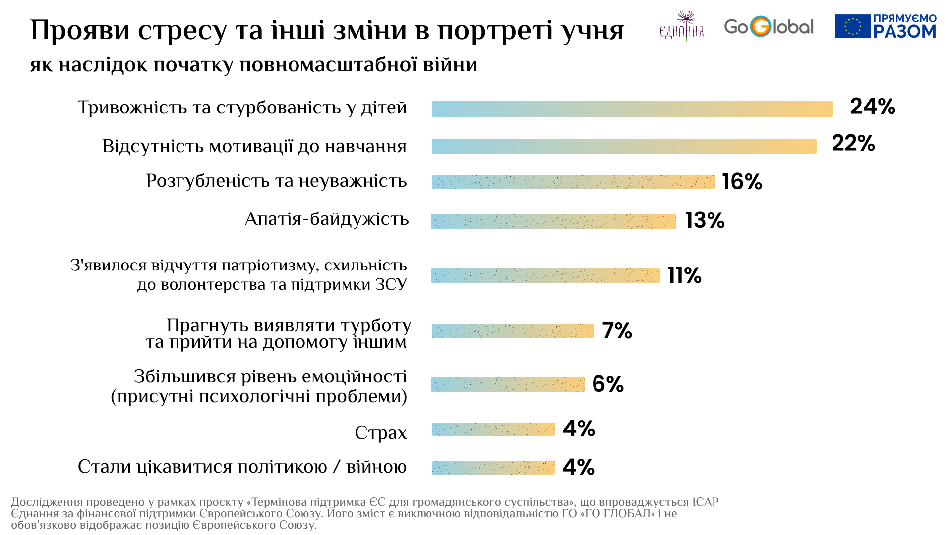 Так, вчителі помічають в учнів тривожність і стурбованість, відсутність мотивації до навчання, апатія та байдужість, а також розгубленість і неуважність. Серед інших проявів — діти швидко подорослішали в теперішніх умовах, стали серйозними та відповідальними.